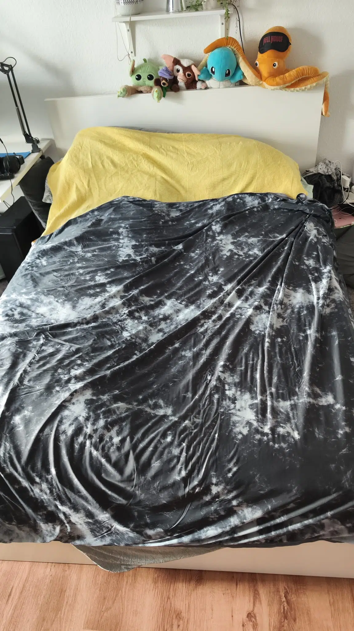 Interessant fand ich es hier, dass sich beide Decken unterschiedlich anfühlen. Die kleinere, graue Decke entspricht wirklich dem seidig-glatten Gefühl, was auf den Werbebildern versprochen wird. Die größere Batik-Decke fühlt sich dagegen etwas rauer und der Stoff leicht schwerer an. Ob das jetzt an der Färbung liegt, keine Ahnung, es macht aber für mich einen minimalen Unterschied.