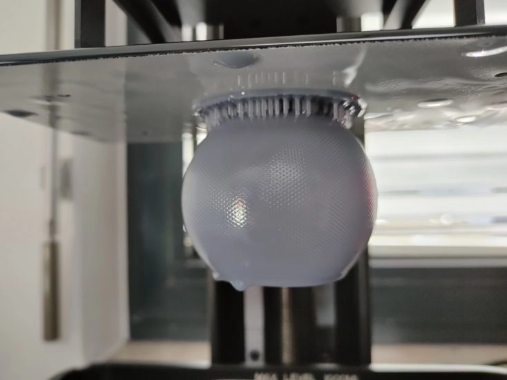 Da die Kugel nach dem Druck durch äußere Umstände zerbrochen ist, habe ich nur die Bilder während bzw. kurz nach dem Druck. Man erkennt aber bereits hier gut die Oberfläche mit den kleinen Vertiefungen. Insgesamt war die Qualität des Drucks hervorragend. Kompliziert war hier lediglich das Entfernen der Supportstrukturen sowie das Aushärten der Innenseite.