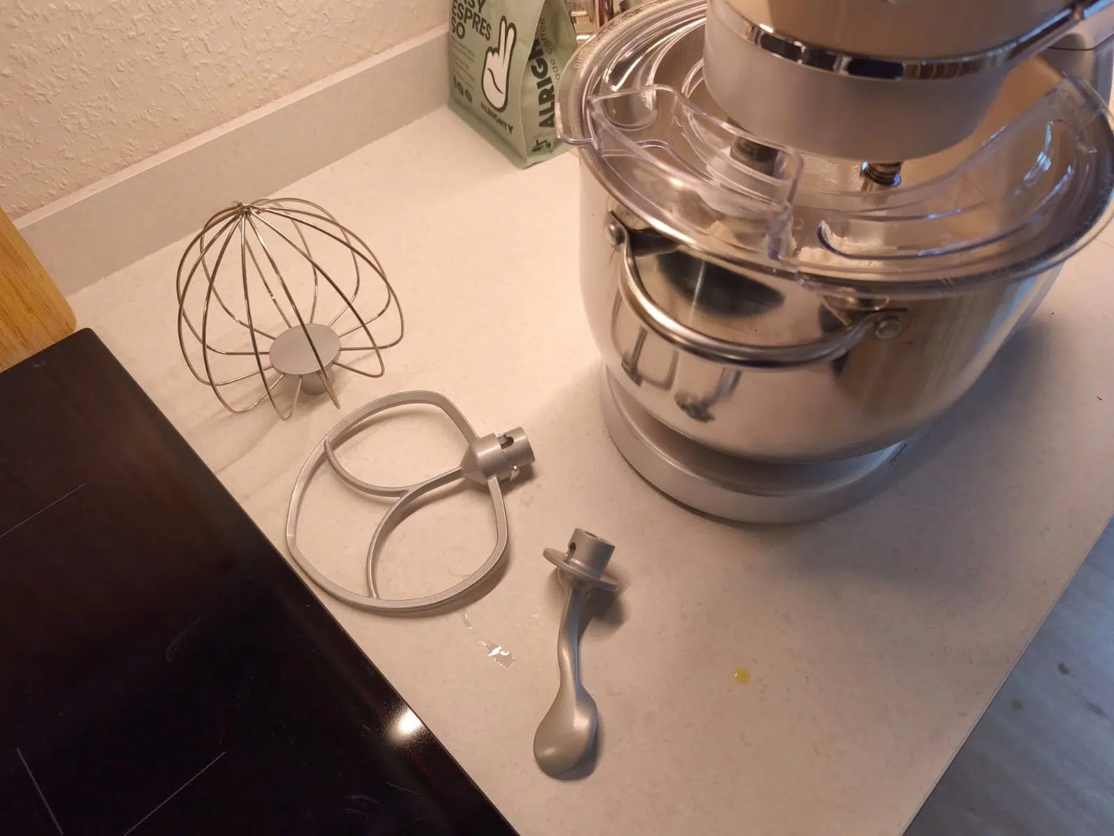 Der Kopf lässt sich per Knopfdruck anheben (Tilt-Head-Design), um die Schüssel oder die Aufsätze zu wechseln. Im Lieferumfang ist alles enthalten, was man für den Start braucht: Doppel-Knethaken, Flachrührer, Schneebesen und ein Spritzschutz mit Einfüllöffnung. Alle Aufsätze sind zudem spülmaschinenfest, bis auf der Spritzschutz. Dieser muss leider von Hand abgewaschen werden. Haken und Rührer sind aus Metall und sehr stabil.