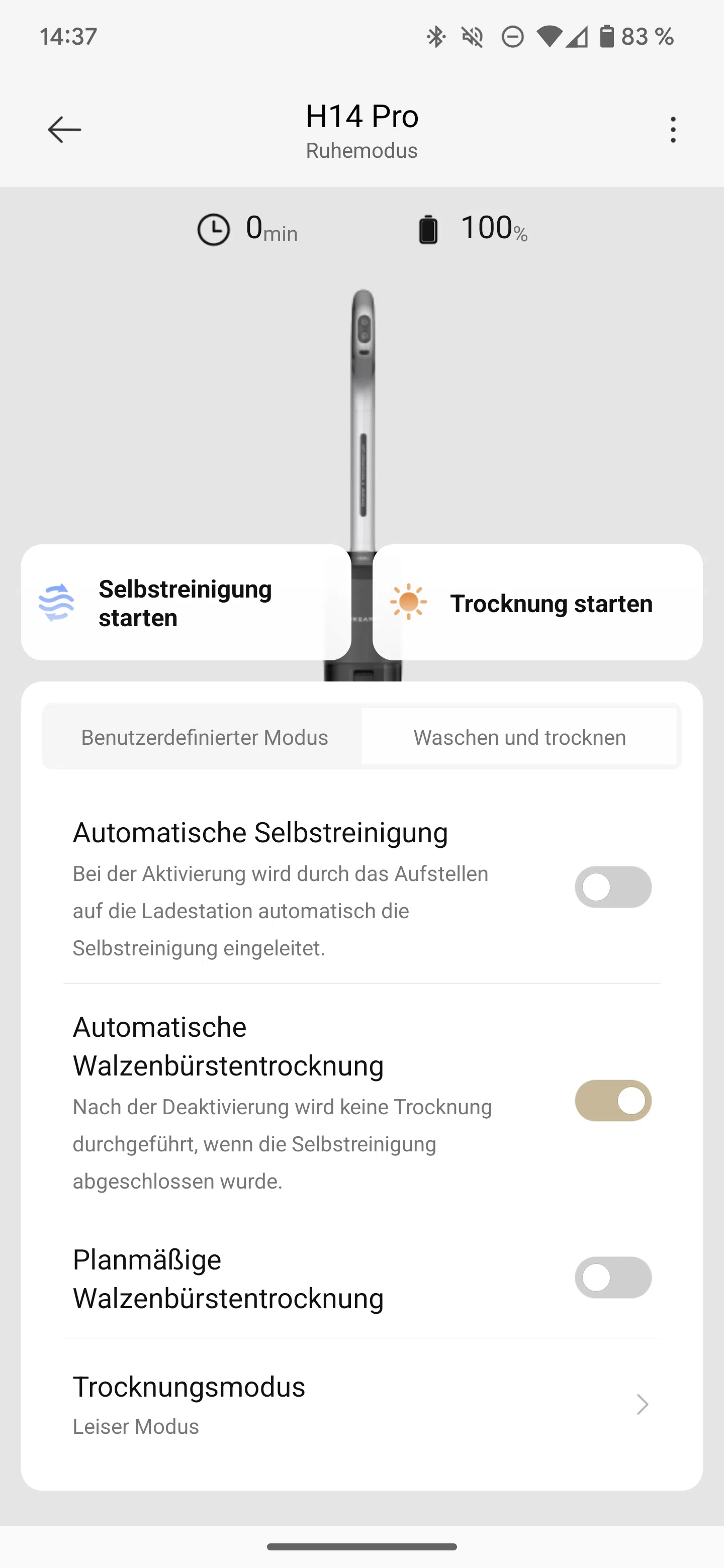 Dreame ist dann jetzt doch dem Trend gefolgt, ihren Wischakkusauger in die eigene App zu integrieren. Es gibt jetzt dadurch den benutzerdefinierten Modus, wo ihr eure eigenen Reinigungseinstellungen festlegen könnt. Auch könnt ihr die Stärke des Eigenantriebs anpassen oder die Selbsttrocknung von „Langsam und Leise“ auf „Schnell und Laut“ umstellen. Ebenfalls kann man aktivieren, dass automatisch die Selbstreinigung startet, wenn man den Wischakkusauger wieder auf die Station stellt.