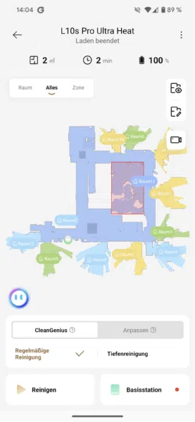 Ihr könnt hier zahlreiche Einstellungen anpassen und mit dem Saugroboter interagieren. Der CleanGenius Modus ist dabei der neue automatische Modus, wo ihr nur zwischen regelmäßiger Reinigung und Tiefenreinigung wählt und der Saugroboter die seiner Ansicht nach besten Parameter dafür auswählt. Unter Anpassen könnt ihr aber weiterhin selber die Einstellungen treffen. Wie üblich könnt ihr den Saugroboter die gesamte Wohnfläche, spezielle Räume oder eine bestimmte Zone reinigen lassen.