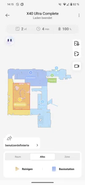 Nach der Einrichtung in der App, könnt ihr den Saugroboter eine Karte generieren lassen. Dabei reinigt er nicht und fährt einmal zügig durch euer Zuhause. Danach bekommt ihr eine Karte, die ihr dann bearbeiten könnt oder wenn alles passt, direkt mit der Reinigung loslegen könnt. Der Roboter teilt die Karte automatisch in verschiedene Räume ein und kann sogar bestimmte Räume wie eine Küche automatisch erkennen. Sollte mal etwas nicht stimmen, könnt ihr die Räume neu einteilen oder anders benennen. Auch ist es hier möglich ganze Räume zu löschen, falls er ihr diese nicht in eurem Reinigungsbereich haben wollt.