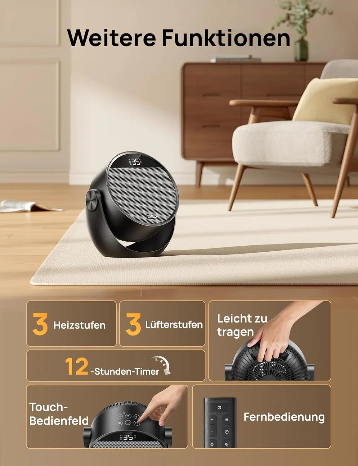 Das absolute Alleinstellungsmerkmal ist die vertikale Neigungsfunktion. Der gesamte Heizlüfter lässt sich manuell in vier Stufen (0° bis 60°) kippen. So kann man den warmen Luftstrom gezielt lenken – flach auf dem Boden für die Füße oder angewinkelt auf dem Schreibtisch für den ganzen Oberkörper.