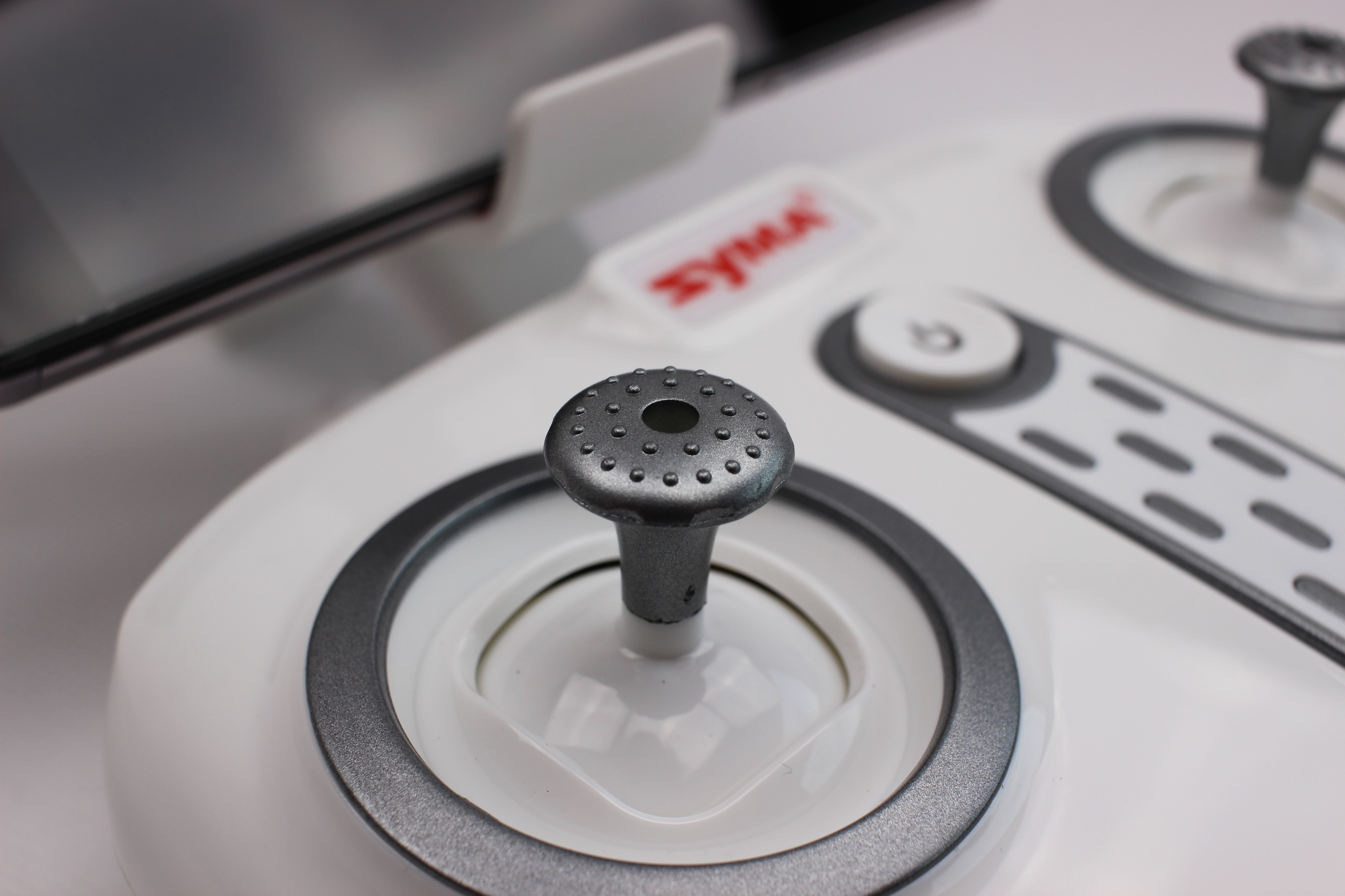 Man könnte meinen, bei Quadrocopter-Steuerungen können man nicht viel anders oder neu machen. Trotzdem unterscheiden sich viele Fernsteuerungen dann doch nicht unwesentlich voneinander, und auch Syma schiebt hier einige Tasten hin und her. Die Sticks sind natürlich an der gewohnten Stelle, außer dem Power-Button sucht man weitere Bedienelemente auf der Vorderseite aber vergeblich. Stattdessen gibt es insgesamt sechs Schultertasten.