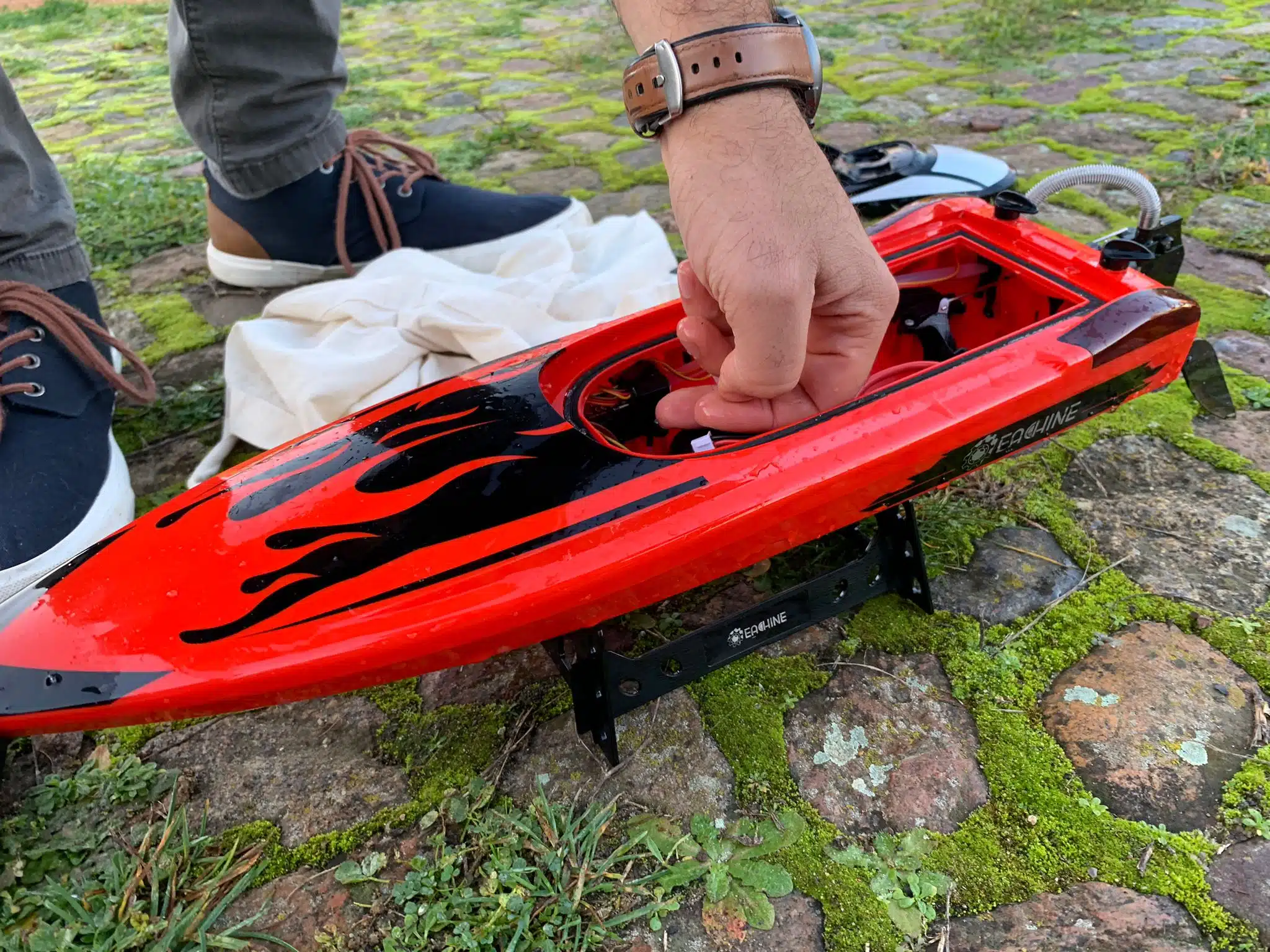 Im Gegensatz zum „kleineren Bruder“, dem EBT04, ist das Eachine EBT05 überwiegend in rot gehalten. Rote Flammen auf schwarzem Hintergrund zieren den Bugbereich des RC-Wasserflitzers. Auf einen Multi-Color-Heckspoiler muss man verzichten und hat stattdessen im Heckbereich hinten links und rechts jeweils zwei breite LED-Streifen, die mittels Fernbedienung rot oder rot-blinkend hinzugeschaltet werden können. Das finde ich sogar besser, weil etwas dezenter als eine fahrende Disko-Kugel auf dem Wasser.