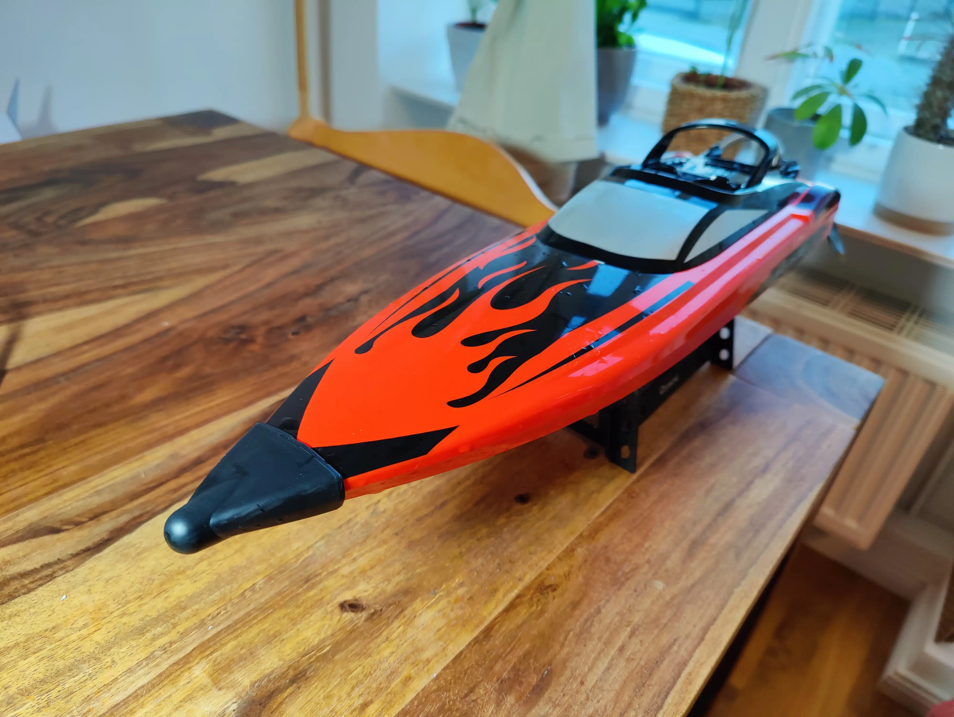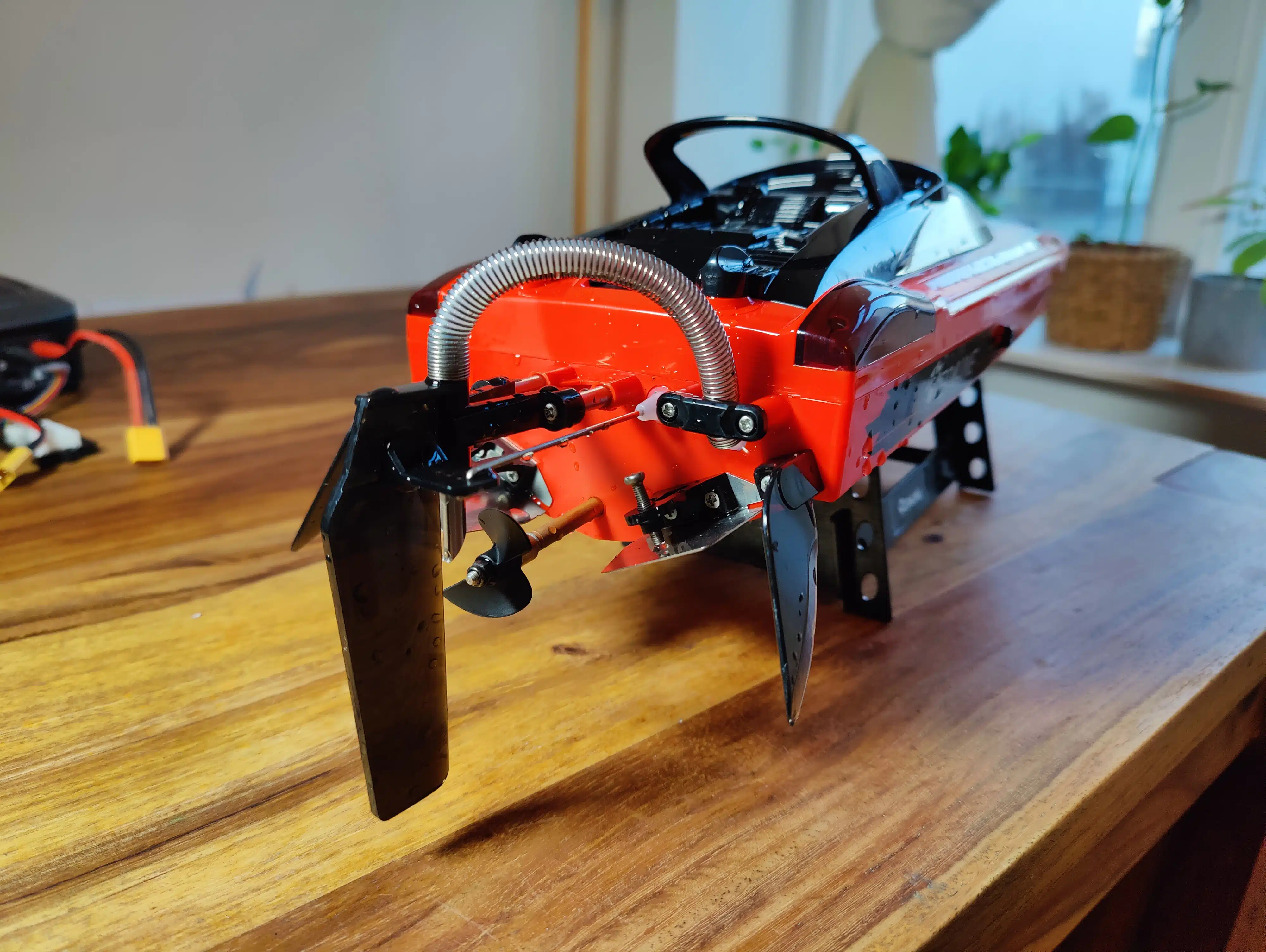 Das Rennboot sieht solide verarbeitet aus und macht einen durchdachten, aufgeräumten Eindruck. Es ist mit 57 x 13,5 x 13,7 cm bemaßt, wiegt ohne Akku ca. 900g und ist überwiegend aus Kunststoff gefertigt. Teile, auf die es ankommt, wie beispielsweise die Ruder-Anlenkung, sind allesamt aus Metall. Die Stabilisatoren rechts und links am Heck gefallen genauso wie der mit Metall-Spirale ummantelte Wasserschlauch, der oben ins Heckruder mündet.