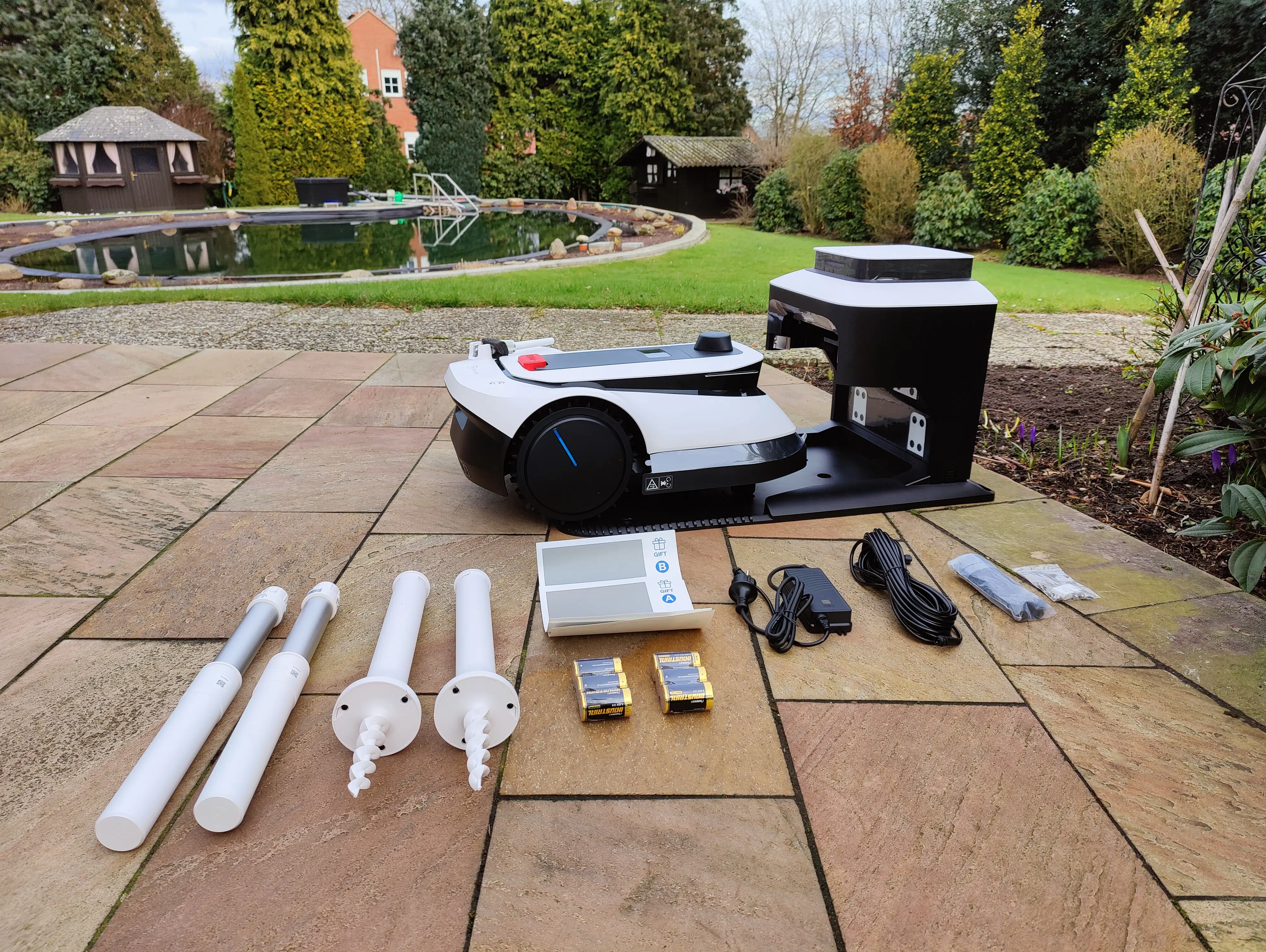 Am Einsatzort angekommen, wird erst einmal ausgepackt. Zum Vorschein kommen dabei neben dem Ecovacs GOAT G1 an sich eine aus einer Matte und Ladeeinheit bestehende Ladestation. Schraubpflöcke mit Inbus-Kopf liegen genauso bei wie Ersatzklingen samt Schrauben sowie ein Netzteil und Verlängerungskabel.