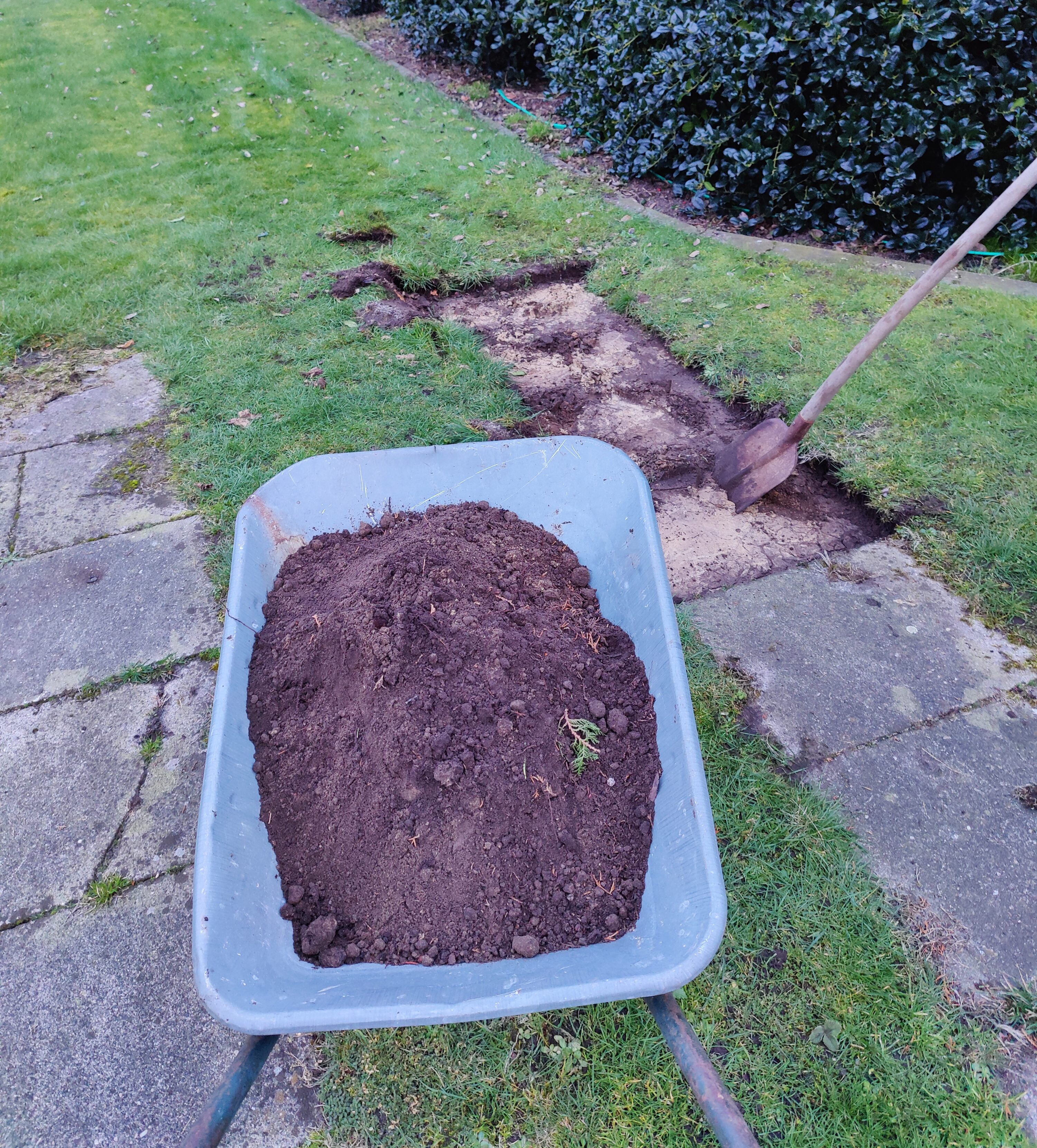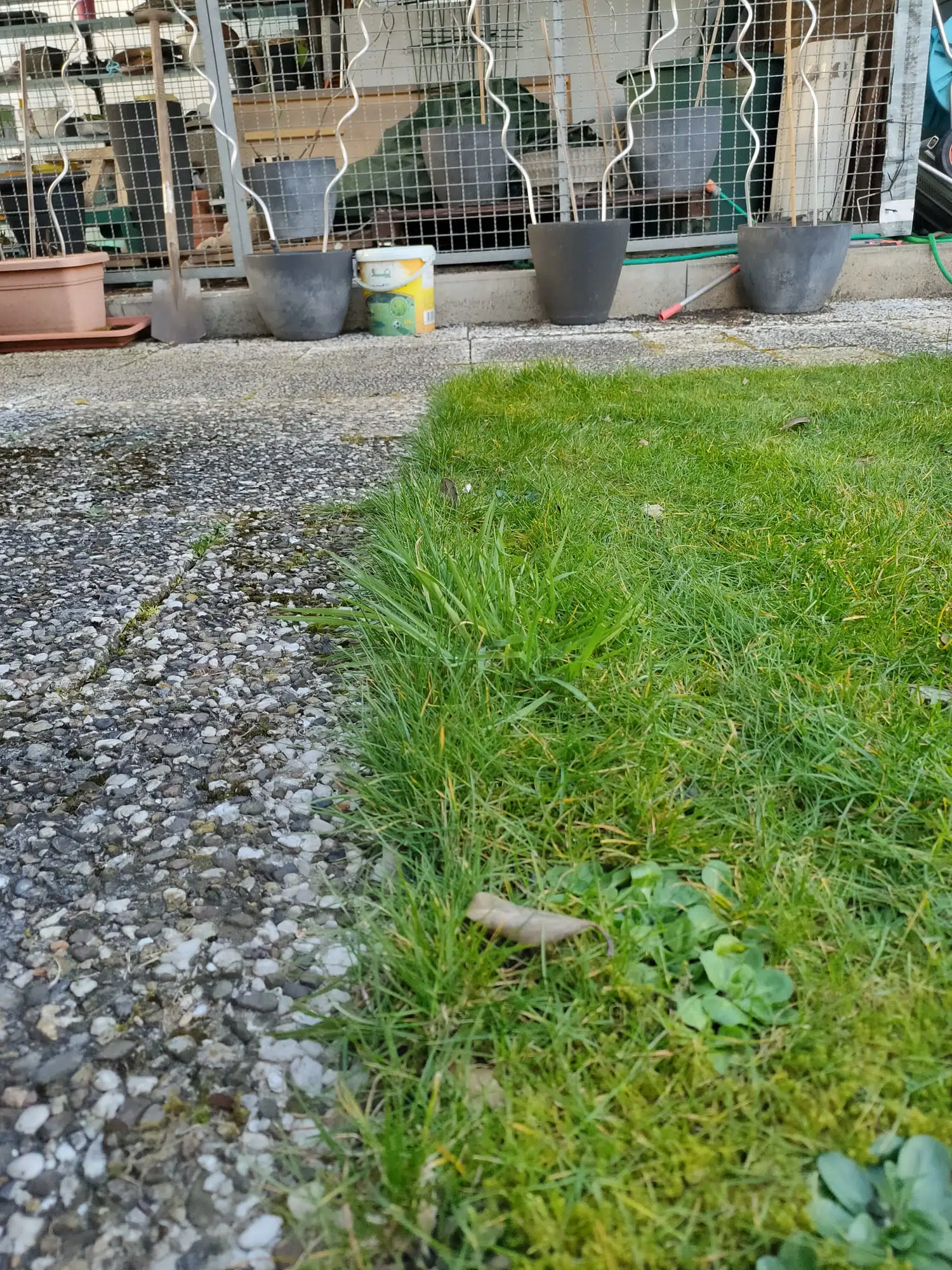 Wir geben nicht auf. Die Steinplatten auf der linken Seite des unüberwindbaren Korridors sollen ohnehin weichen. Also buddeln wir, entfernen die Platten, füllen Erde nach und setzen dort Grasplaggen ein. Der Korridor ist jetzt ca. 1,5 Meter breit – aber es dämmert schon. Da der Kartierungsprozess laut Ecovacs zwecks ausreichender Helligkeit zwischen 8 und 18 Uhr stattfinden soll, verschieben wir das weitere Testprozedere.