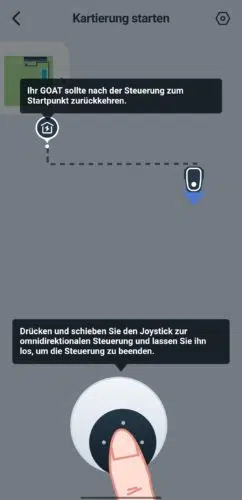 Jetzt sind die Baken also platziert, die Kartierung via App kann beginnen. Dazu erscheint unten in der App ein virtueller Joystick. Ist das Grundstück klein, kann ich den GOAT G1 über den Wifi-Modus damit steuern, ist es aber groß, muss ich auf den Bluetooth-Modus zurückgreifen. Einen Hinweis darauf hätte ich mir in der App direkt gewünscht – ich bin nämlich natürlich mit dem Wifi-Modus angefangen – und schnell an meine (Wifi-)Grenzen gestoßen.