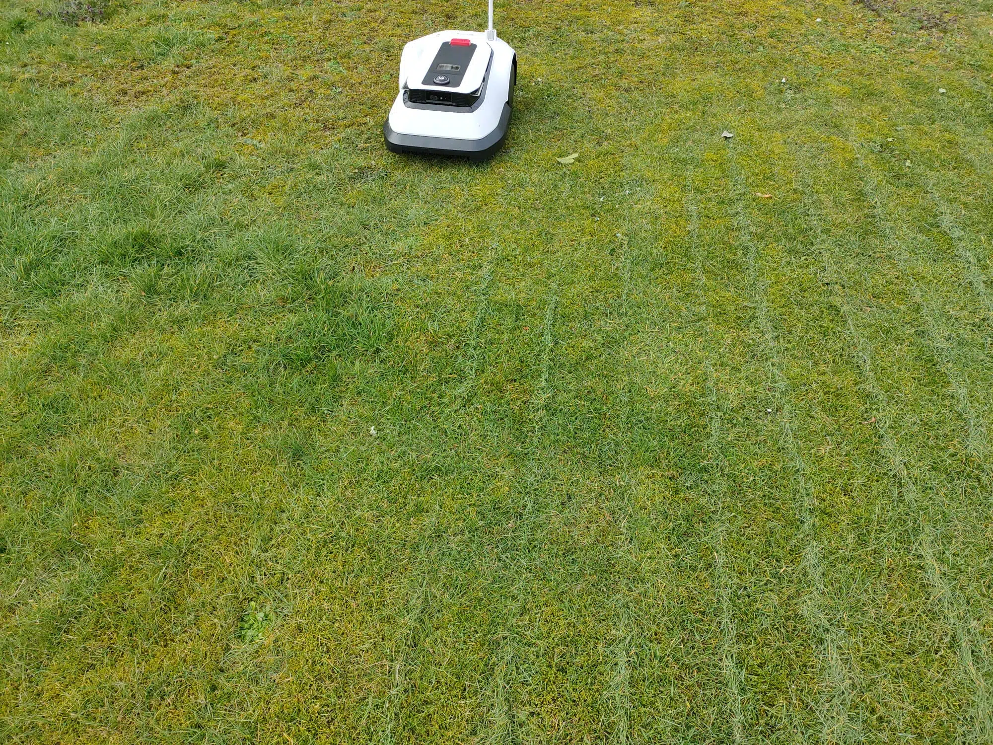 Der erste Mähtest fängt ernüchternd an: Der GOAT scheint zuerst gar nicht zu mähen. Fairerweise muss man ihm zugute halten, dass der Rasen nass ist und durch seine ausgedehnten Erkundungsfahrten in Parallelbahnen auch schon gut plattgedrückt ist. Zudem scheinen sich die (nassen) Grashalme unter ihm tendenziell eher wegzubiegen, als dass sie abgemäht werden.