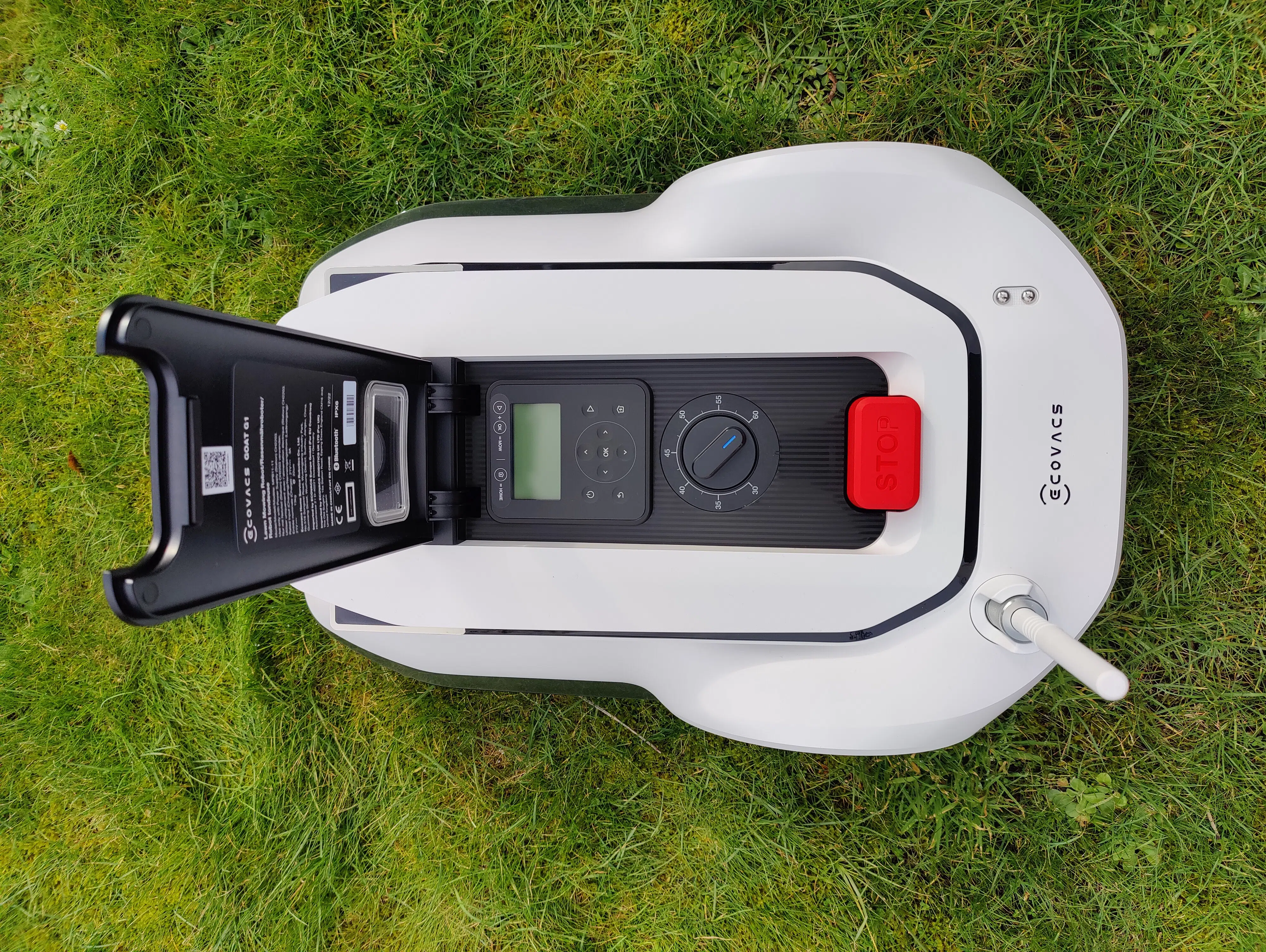 Auffallend ist hier neben der mit einer Schutzkappe verdeckten 360 Grad Panoramakamera der große rote STOP-Knopf auf dem hinteren Oberseitenbereich. Unter einer Längsklappe auf dieser Oberseite befindet sich ein Display. Darüber sind Tasten zur Ladestation-Rückkehr (Home) und zum Mähen „Mow“ zu finden. Unterhalb des Displays befindet sich ein Tastenfeld und wiederum darunter dann ein Drehschalter zur Einstellung der gewünschten Grashöhe in Millimeter (Schnitthöhe zwischen 30 und 60mm einstellbar).