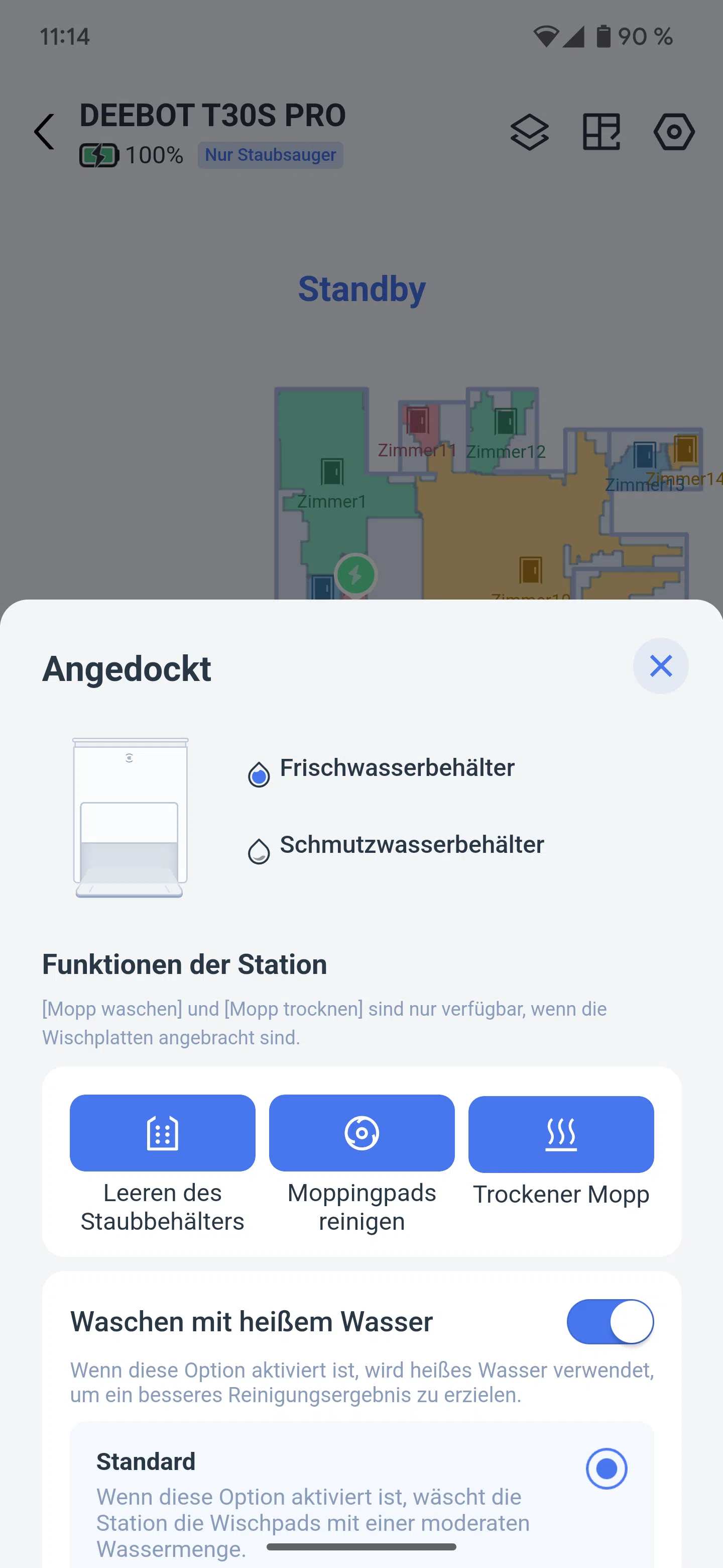 Unten befindet sich dann die „Garage“ für den Saugroboter und die Reinigungswanne für die Wischmopps. Dort werden die Wischmopps vor, während und nach der Reinigung gesäubert. Das Wasser kann dabei auf bis zu 70°C erhitzt werden, wodurch Verschmutzungen besser aus dem Mopp gelöst werden können. Nach der Reinigung sorgt ein Gebläse dafür, dass die Mopps zügig trocknen und keine Bakterien und Gerüche entstehen können.