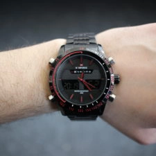 Ich habe recht große Handgelenke, das ist aber mit der Naviforce kein Problem und sie liegt mit einem guten Gewicht angenehm an. Ich trage sie täglich und nutze die zwei Zeitanzeigen für verschiedene Zeitzonen. Leider gibt es keine fluoreszierende Elemente, auf Knopfdruck kann das LCD Display aber immerhin beleuchtet werden. Der Verschluss sitzt fest und ist zusätzlich mit einem kleinen Bügel gesichert.