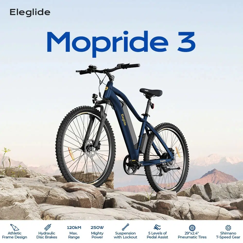 Nach dem Mopride 3 werfen wir einen Blick auf das Eleglide Mopride 2. Das Modell ist ebenfalls für den Offroad-Einsatz konzipiert und rollt wie sein Geschwistermodell auf 29 x 2,4 Zoll breiten Mountainbike-Reifen, die auf unebenem Gelände viel Traktion und Stabilität bieten. Ein deutlicher Unterschied liegt in der Schaltung: Während das Mopride 3 eine 7-Gang-Schaltung besitzt, kommt das Mopride 2 mit einer 24-Gang Shimano-Schaltung (3 Gänge vorne, 8 Gänge hinten). Das ermöglicht euch eine noch präzisere und mühelosere Anpassung an Steigungen oder hohe Geschwindigkeiten auf der Ebene.