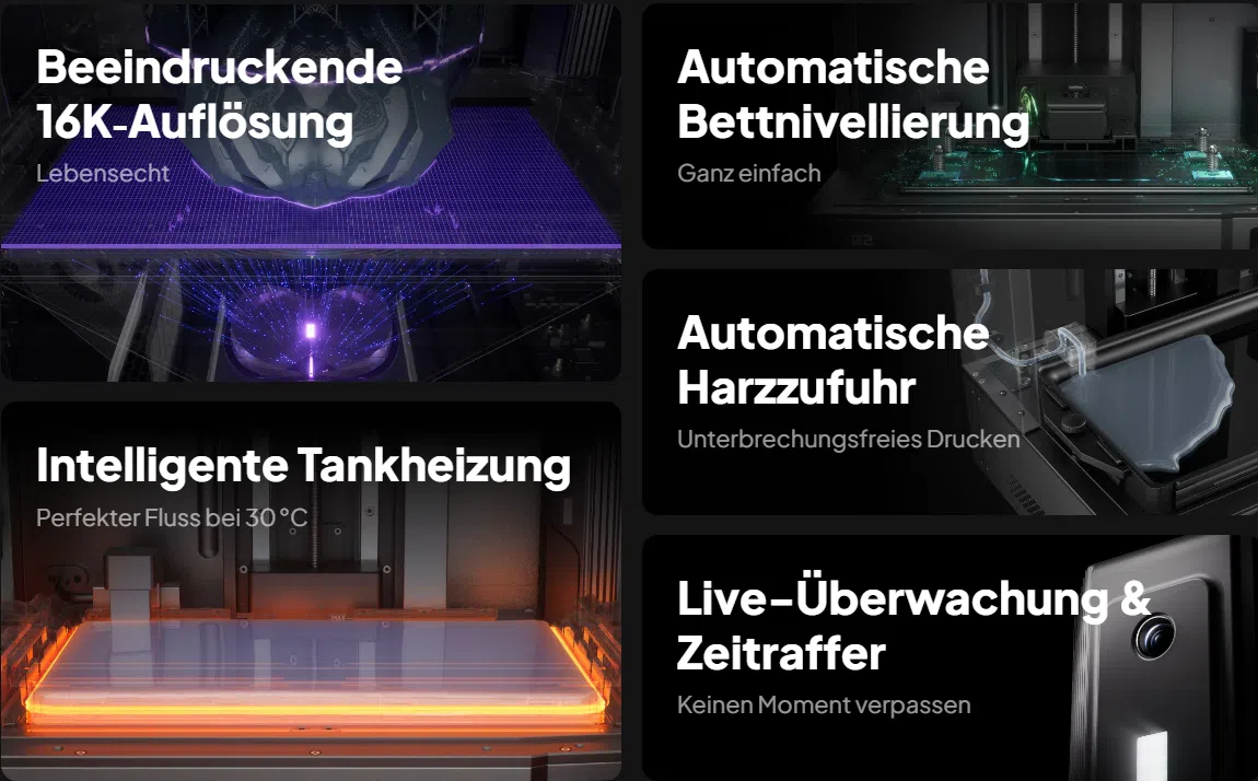 Der eigentliche Mehrwert liegt jedoch im Handling. Zunächst levelt sich das Druckbett vollautomatisch. Zudem verfügt der Drucker über ein intelligentes Harz-Management. Das flüssige Resin wird automatisch in den Tank gepumpt. Dazu integriert Elegoo eine aktive Tankheizung samt Temperatur-Sensoren. Das löst ein klassisches Problem im Winter. Ist das Harz zu kalt, wird es zähflüssig und der Druck scheitert. Die Heizung sorgt somit für einen perfekten Fluss. Fällt einmal der Strom aus, rettet die „Power Loss Recovery“ den Druckfortschritt.