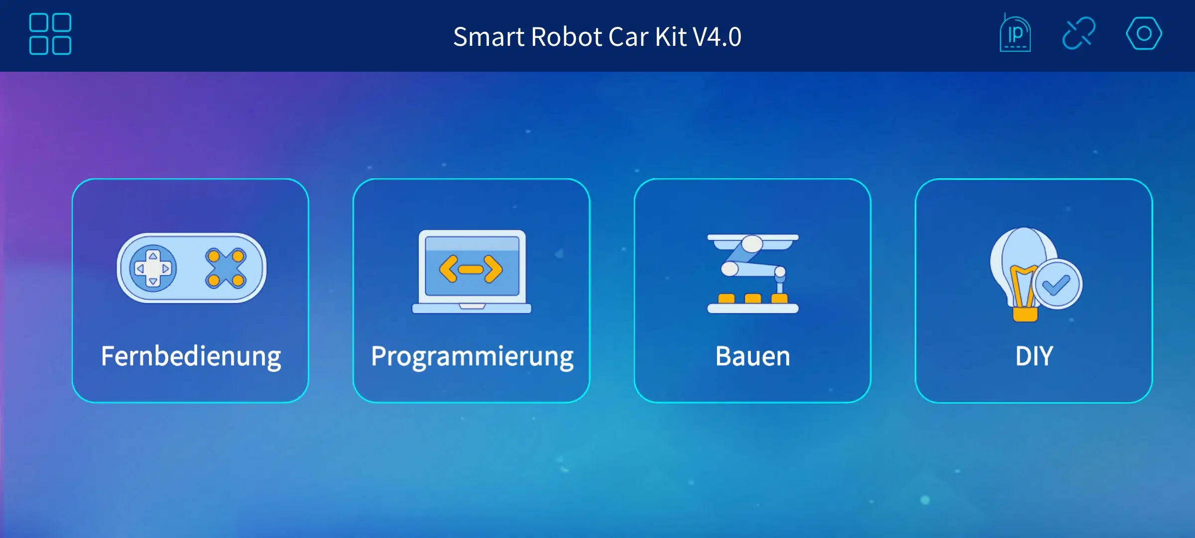 Die ELEGOOKit-App ist einfach aufgebaut. Zuerst einmal verbindet das Smartphone mit dem ELEGOO-WLAN und stellt über das Büroklammer-Icon im Homescreen der App oben rechts die Verbindung zum Roboterauto her. Dann kann es auch schon losgehen. 6 Menüs stehen zur Auswahl, darunter Menüs für den Aufbau mit Handbuch in digitaler Form und Erklärvideos. Besonders interessant sind die beiden ersten Menüs „Fernbedienung“ und „Programmierung“.