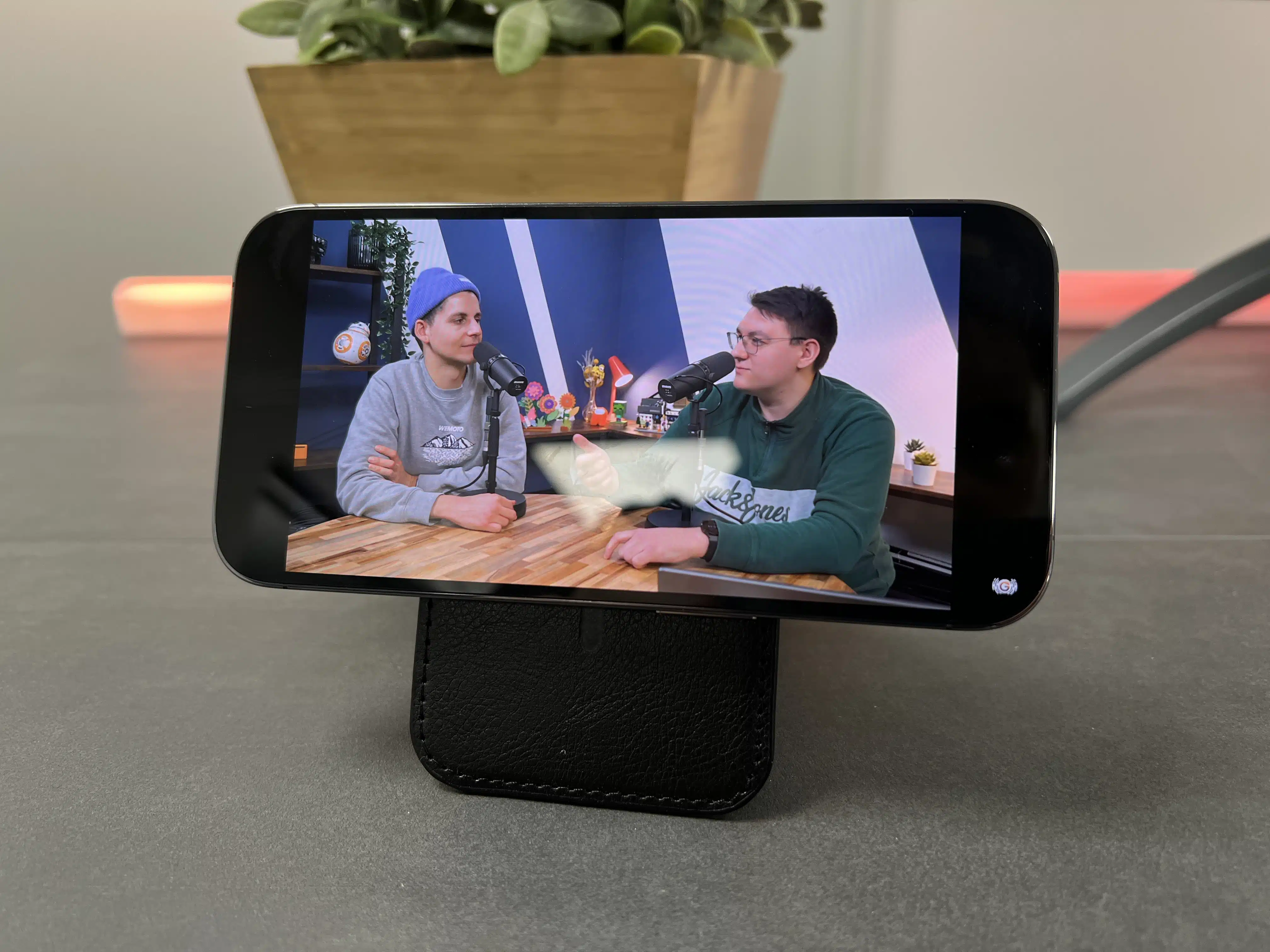 Die zusätzliche Besonderheit des Wallets ist der integrierte Smartphoneständer. Da das Wallet aufklappbar ist, kann man das Smartphone so auch hinstellen. Das funktioniert überraschend gut. Der Anwendungswinkel liegt dabei zwischen schätzungsweise 10° und 160° – ein Geodreieck fehlt uns noch bei den Messinstrumenten. So lässt sich das Handy praktischerweise auf den Schreib- oder Nachtisch stellen, kann so aber nicht geladen werden. Dafür kann man das Smartphone aber auch um 90° drehen und auch in der Horizontalen benutzen. Echt praktisch zum YouTube gucken beim Kochen, genauso gestern passiert. Das Drehen funktioniert in beide Richtungen.