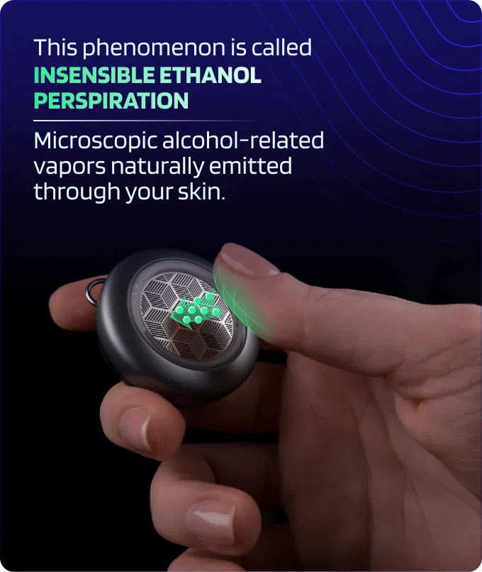 Der Hersteller spricht hier von „Insensible Ethanol Perspiration“, zu Deutsch die unbemerkte Abgabe von Alkohol über den Schweiß. Das Gerät soll sich das zu Nutze machen und den Alkoholanteil im Schweiß messen – in diesem Fall am Finger.