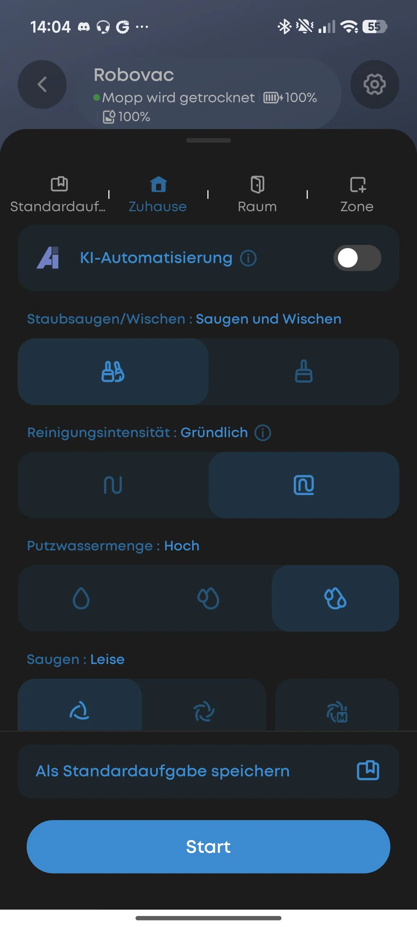 Ihr könnt z. B. die Räume anpassen, Teppiche entfernen/anpassen oder mithilfe von Sperrzonen den Reinigungsbereich anpassen. Es gibt zwei Reinigungsmodi: Saugen und gleichzeitiges Saugen und Wischen. Ebenso könnt ihr eine schnelle oder gründlichere Reinigung auswählen und Saugstufen bzw. Wasserabgabe wählen. Wer keine Lust darauf hat, kann auch den automatischen KI-Modus aktivieren.