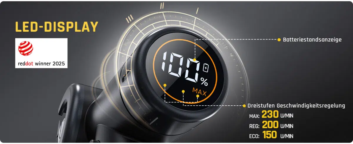 Fanttik wäre nicht Fanttik, wenn nicht auch ein paar durchdachte Features an Bord wären. Ein LED-Display zeigt jederzeit den Akkustand und die gewählte Geschwindigkeitsstufe an, was für eine präzise Kontrolle sorgt. Ein integriertes LED-Licht leuchtet den Schneidebereich aus und verbessert die Sicht, besonders in schattigen Ecken.