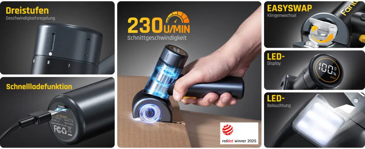 Kennt ihr das? Weihnachten, Geburtstage oder Online-Shopping-Exzess: Manchmal stapeln sich Kartons, die man dann per Cutter für die Tonne mühselig zerkleinern muss. Vielleicht wartet aber auch nur das nächste Bastelprojekt, wo ihr Stoff, Leder oder dünnem Teppich schneidet. Genau hier will Fanttik mit der neuen C8 Nano elektrischen Schere ansetzen und das lästige Hantieren mit Cuttermessern oder stumpfen Scheren überflüssig machen. Aktuell gibt es das kleine Kraftpaket für 44,99€ im Angebot bei Amazon.