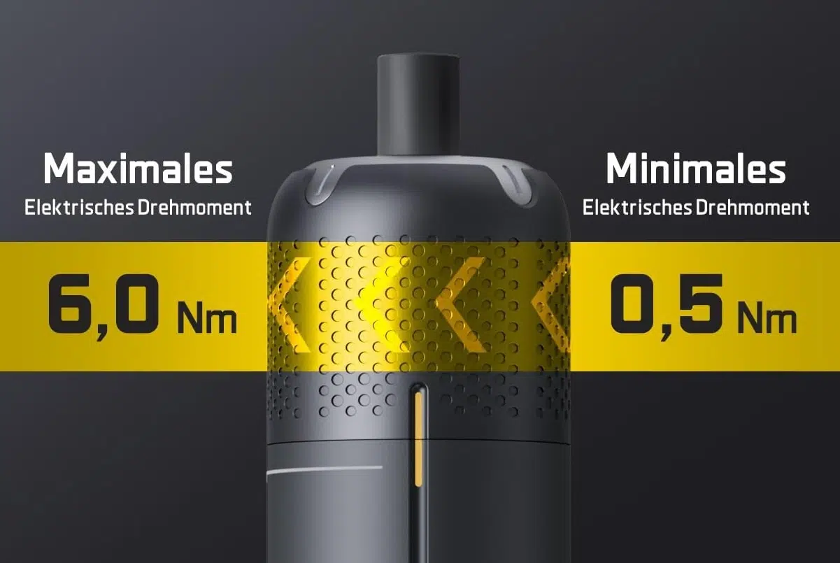 Der eigentliche Clou ist aber die Dosierung. Über ein hybrides System lassen sich 7 Drehmomentstufen einstellen. Die kleinste Stufe startet bei 0,5 Nm – das ist der Sweetspot für empfindliche Elektronik, Laptops oder den 3D-Drucker, an dem man nichts zerbrechen will. Das Ganze wird visuell über ein Display unterstützt, das euch nicht nur den Akkustand, sondern auch die Kraftstufe und die Drehrichtung anzeigt. Spielerei? Vielleicht. Hilfreich? Definitiv.