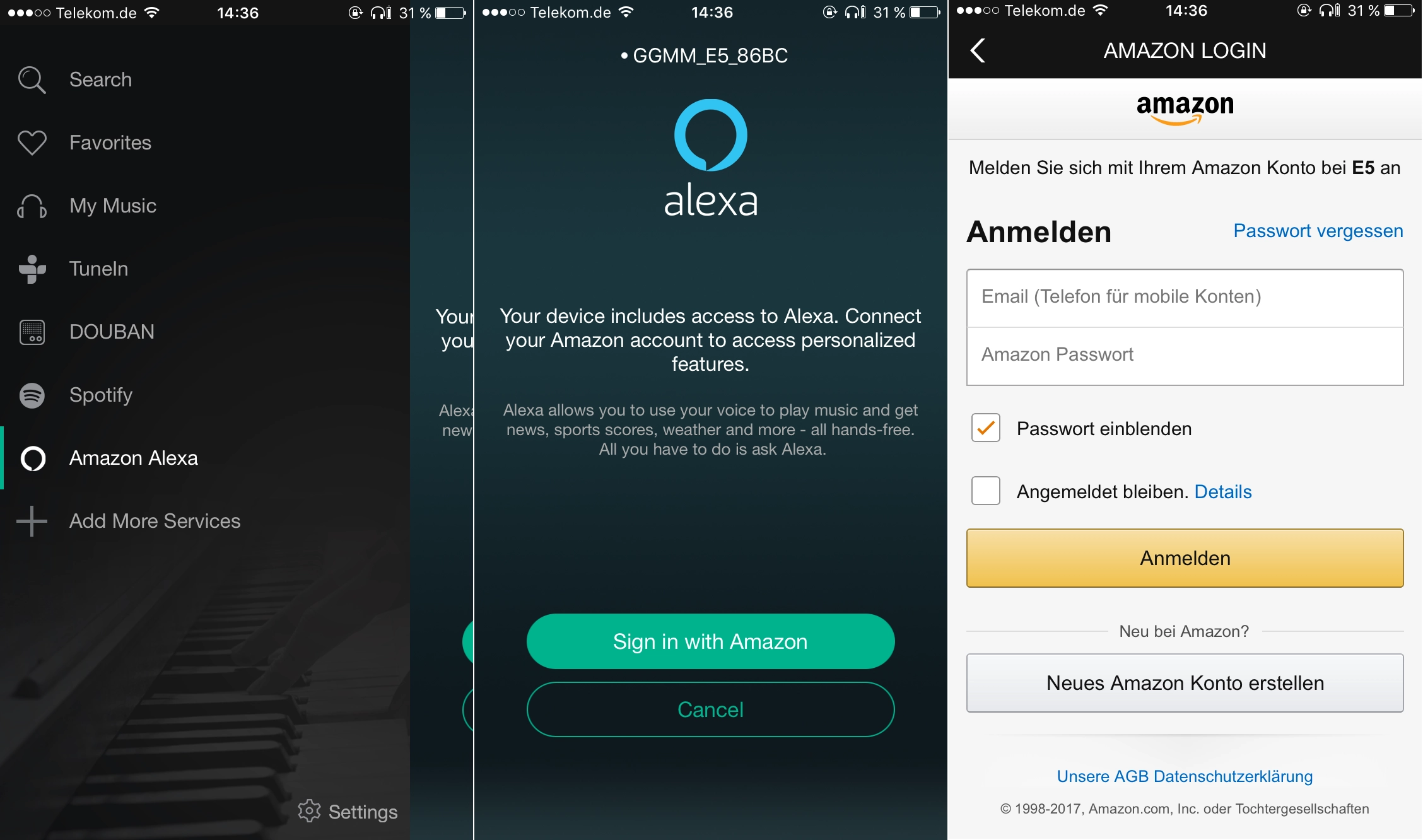 Um Amazon Alexa mit dem GGMM E5 nutzen zu können, muss zunächst die die aktuellste Software per App auf den Speaker geladen werden, dafür muss dieser im Netzbetrieb sein. Nachdem die Software auf den aktuellsten stand gebracht wurde findet man in der Services Übersicht den Punkt „Amazon Alexa“. Nun ist die Einbindung denkbar einfach, per GGMM E5 App mit dem Amazon-Konto anmelden – fertig.