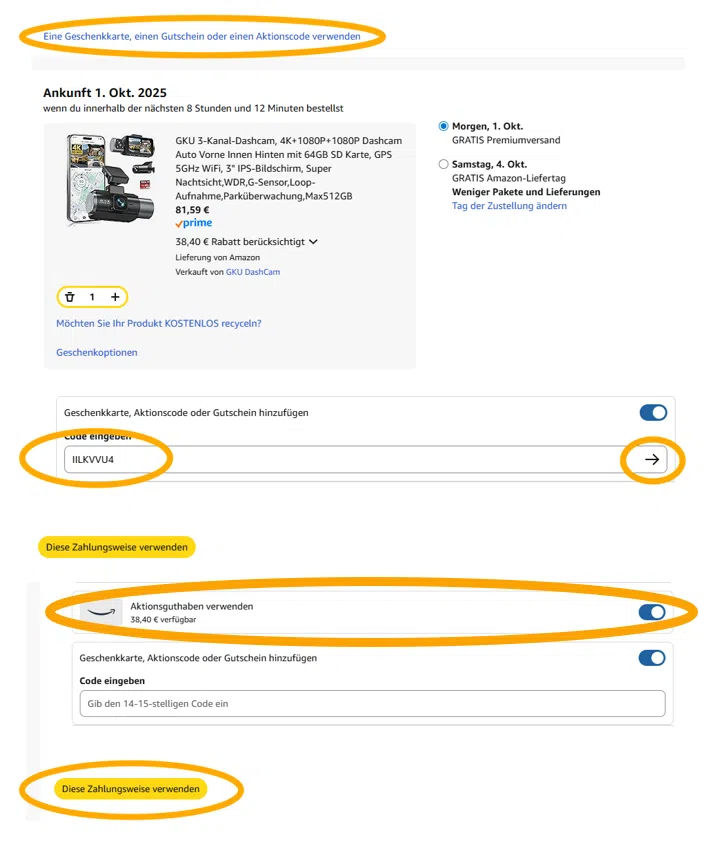 3. Aktionsguthaben auswählen (Aufgelistet unter Zahlungsweisen)