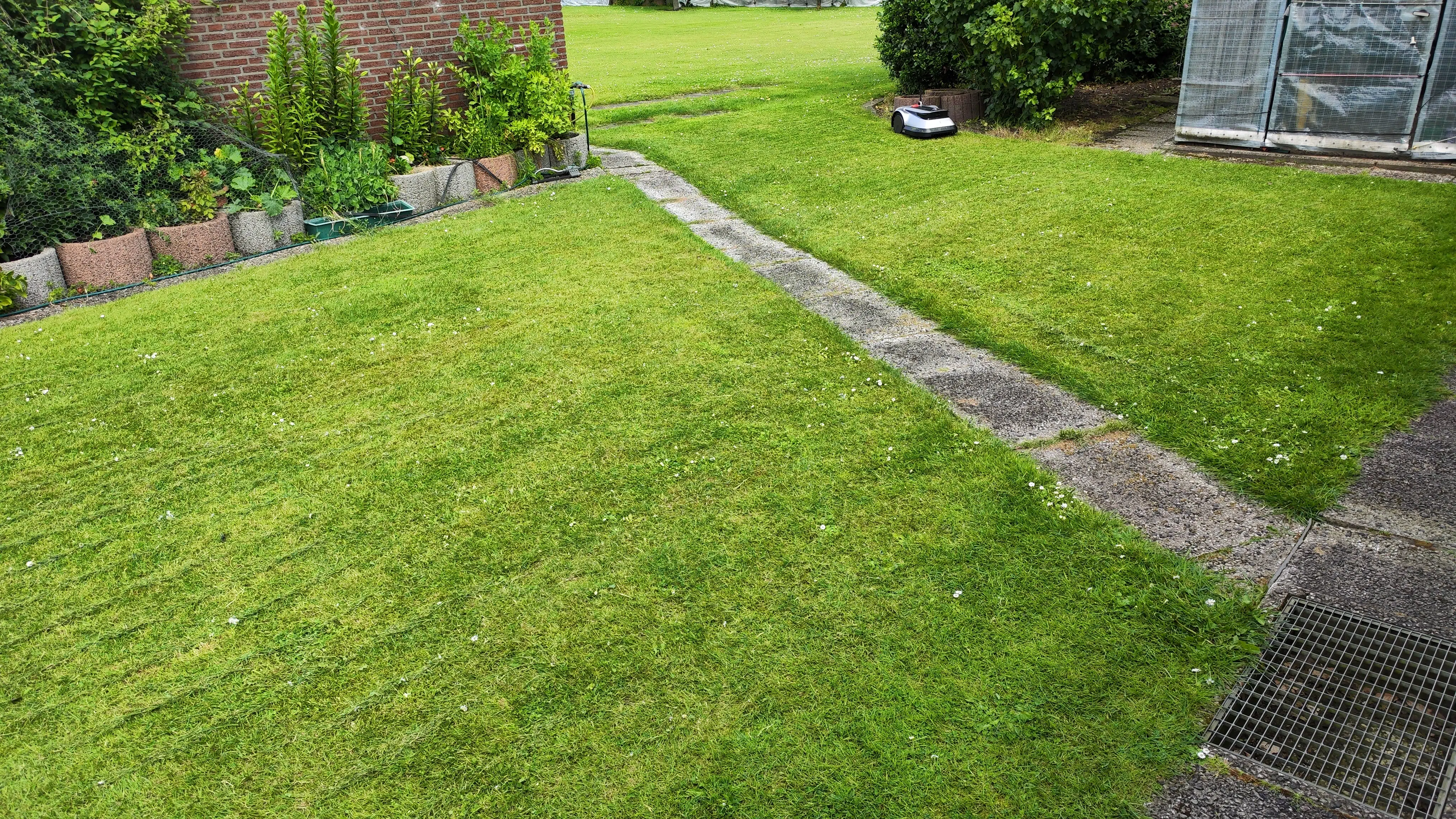 Einmal vorweg: Der GOAT G1-2000 mäht an sich sehr gut in klaren abgefahrenen Bahnen im Parallelschnitt. Dafür wähle ich den „Auto-Mähmodus“, welcher zuerst den „Raum“ brav in Parallellinien bei einer Schnittbreite von 22cm „abgrast“ und in einem Abschlussdurchgang dann einmal einen Randschnitt vollführt.