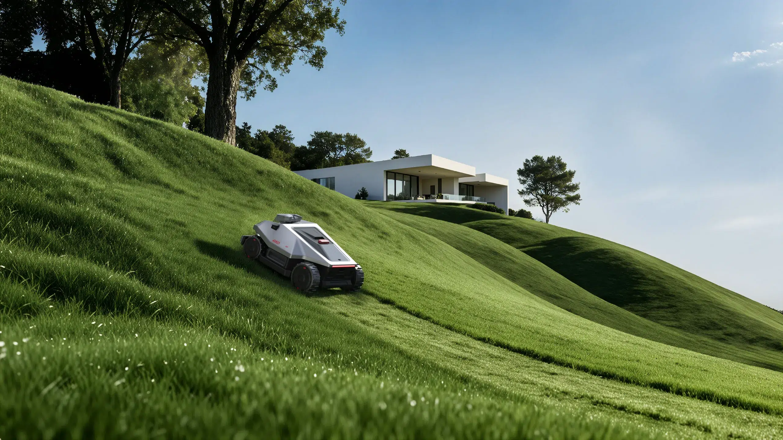Das zeigt sich vor allem beim Antrieb. Der M6 setzt auf einen kräftigen Allradantrieb, der Steigungen von bis zu 90 Prozent (42 Grad) bewältigen soll. Zum Vergleich: Die meisten normalen Mähroboter kapitulieren bei 45 Prozent, selbst der geländegängige Mammotion Luba 2 ist hier nicht stärker aufgestellt. Damit klettert der Goko M6 quasi Wände hoch. Auch Kanten und Wurzeln bis zu einer Höhe von 7,5 Zentimetern sollen für das Fahrwerk kein Problem darstellen.