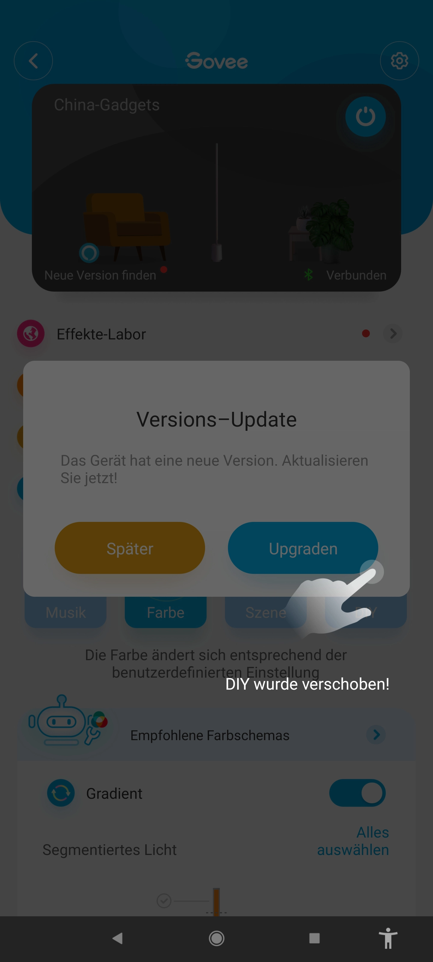 Im Farbmodus kann man verschiedene Farben über die App stufenlos einstellen. Dazu bekommt man unten eine Palette an Farben. Wem die Farben nicht ausreichen sollten, der kann diese mit den Reglern und dem Farbkreis unterhalb der Farbauswahl noch einmal anpassen. So bekommt ihr sicherlich eine Farbe, die passt. 🙂 Die Govee Lyra ist in acht Abschnitte eingeteilt, wodurch jeder Abschnitt unterschiedlich leuchten kann.