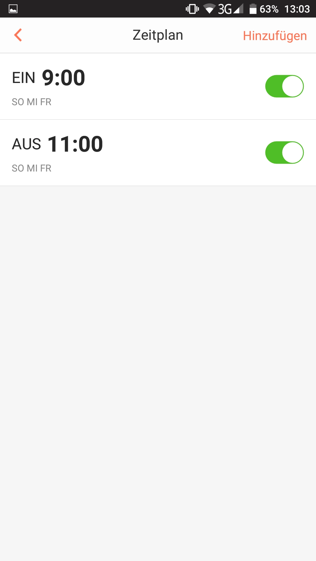 Hat man den Roboter mit der App verbunden, lässt sich darüber nachvollziehen, wie viel Akkuleistung dem XShuai noch verbleibt und in welchem Modus (Standby, Saugmodus, lädt auf) sich der Saugroboter befindet. Nach einmaligem Antippen des erkannten Saugroboter-Buttons auf dem Smartphone wechselt die Ansicht in die „Sicht des Saugroboters“ aus der Kamera des XShuai. Neben der Lenkung lässt sich hier auch der Saugmodus wählen. Das Einplanen der Arbeitszeiten für den Sauger ist, wie schon weiter oben im Text erwähnt, vorbildlich und extrem einfach (s. Screenshots). So lässt sich festlegen, ob der Sauger jeden Tag oder nur zweimal die Woche zu bestimmten Uhrzeiten seinen Dienst antreten soll.