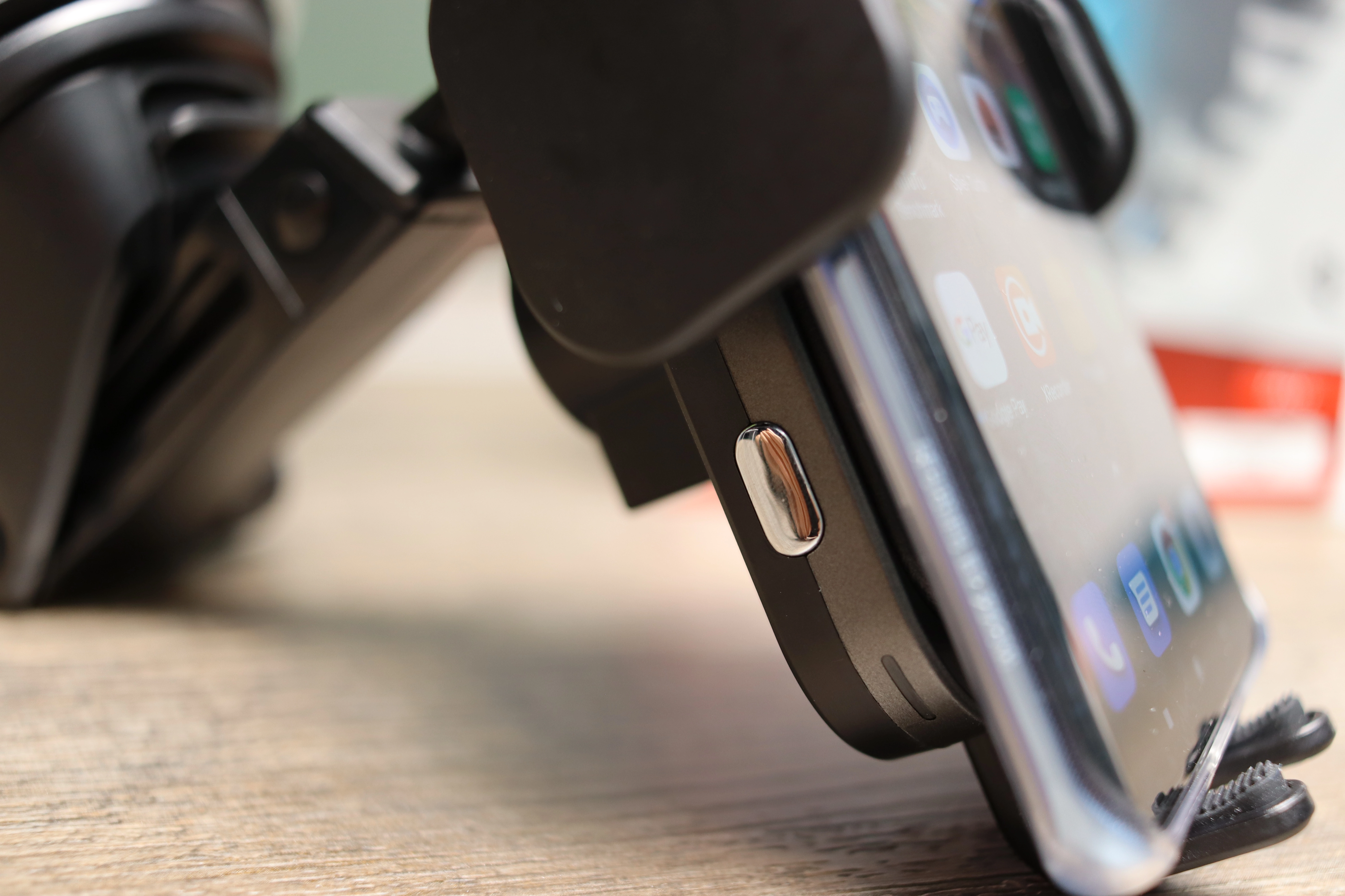 Dafür erleichtert das hama KFZ-Qi Ladegerät das Ein- und Ausstecken des Smartphones. Dafür muss man die Halterung per mitgeliefertem USB-C Kabel mit Strom versorgen. Dann kommen die beiden Sensor-Tasten links und rechts zum Einsatz. Berührt man eine, öffnet sich die Klammer, um das Smartphone einzulegen. Sobald das Handy eingelegt wurde, schließen sich die Halteklammern automatisch! Das geht auch, wenn das Smartphone nicht Qi-fähig ist – sehr cool. Anscheinend hat sich hama diese Technologie sogar patentieren lassen und sie funktioniert noch bis zu fünf mal, wenn der Stromzufuhr beendet wird.