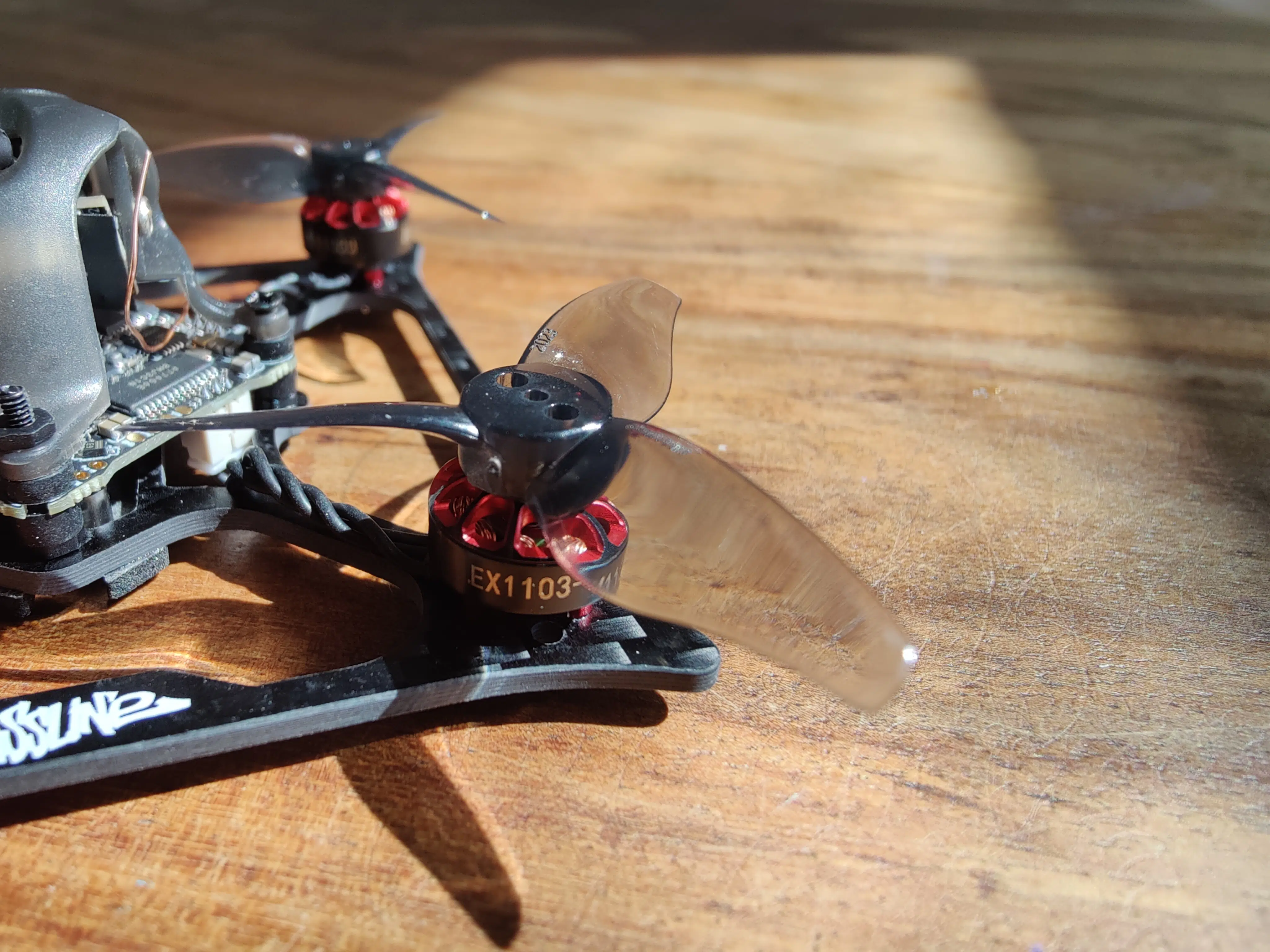 Den stabilen Eindruck vermittelt insbesondere der Carbonrahmen, der nahtlos in die ebenfalls aus Carbon gefertigten X-Arme der Drohne über geht und ihr dank Maßen von 115 mm x 115 mm x 40 mm ein quadratisches Äußeres verleiht. An den Ecken dieses Rahmens sitzen die vier rot-schwarzen EX1103 -Motoren (KV11000), welche mit aus PC gefertigten Gemfan-Tri-Blade-Propellern bestückt sind. Das Kabel für den Stromanschluss mittels XT-30-Buchse führt zur Unterseite des Mini-Kopters. Dort zu sehen ist neben den Motorenanschlüssen auf dem Flight-Controller ein Micro-USB-Datenport.