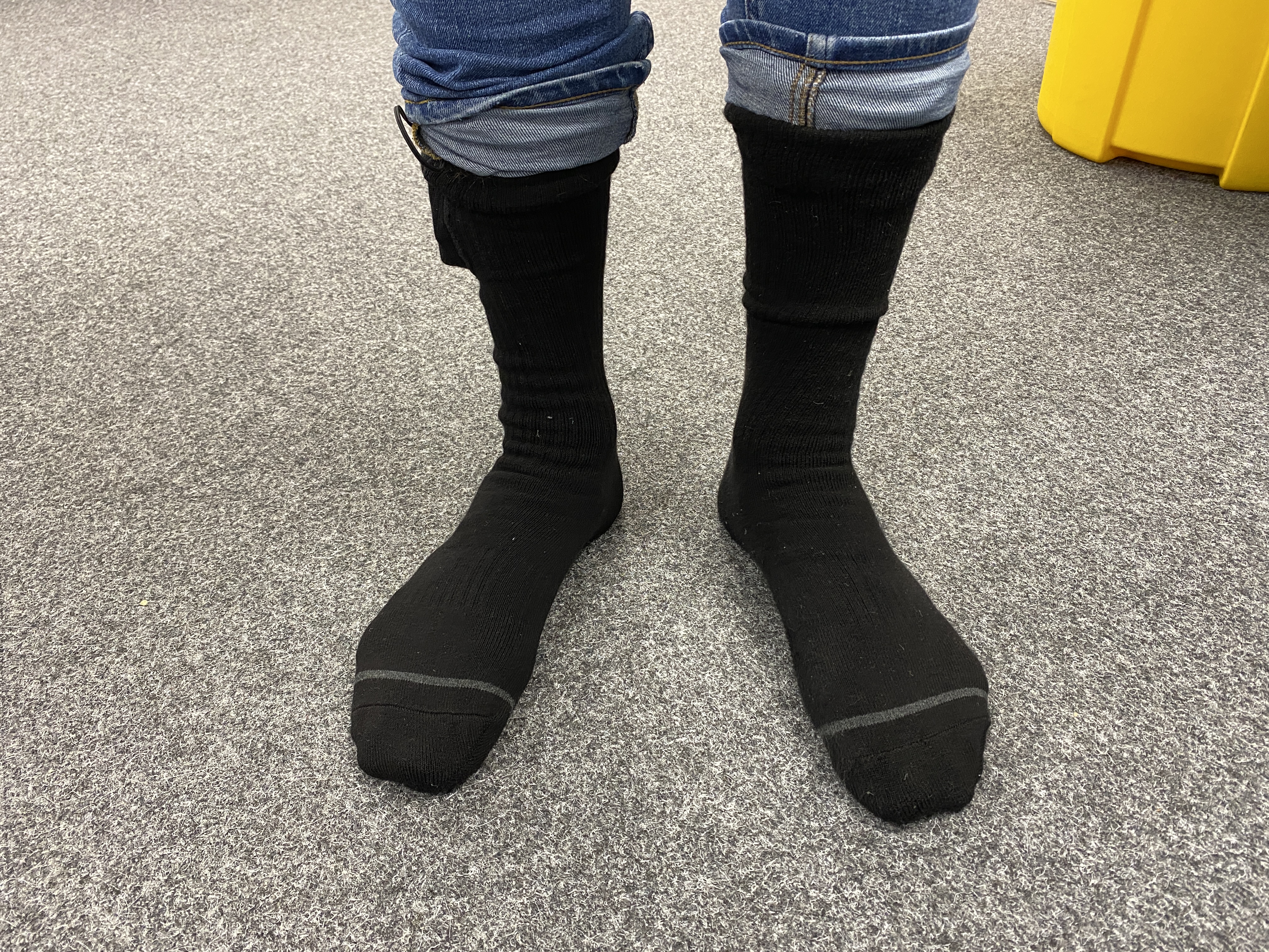 Die Socken fallen wirklich relativ groß aus. Mit Größe 46 gehen mir die Socken bis zur Mitte der Wade, was ich aber gerade im Winter als angenehm empfinde. Die Socken sind ziemlich dick und haben wegen des Batteriefachs oben eine leichte Ausbeulung. Wenn man Skinny Jeans trägt, fällt die Hose nicht einfach so darüber, hier muss man selbst etwas nachhelfen. Insgesamt machen die Socken als Socken einen sehr soliden Eindruck, die Langlebigkeit konnten wir noch nicht überprüfen.