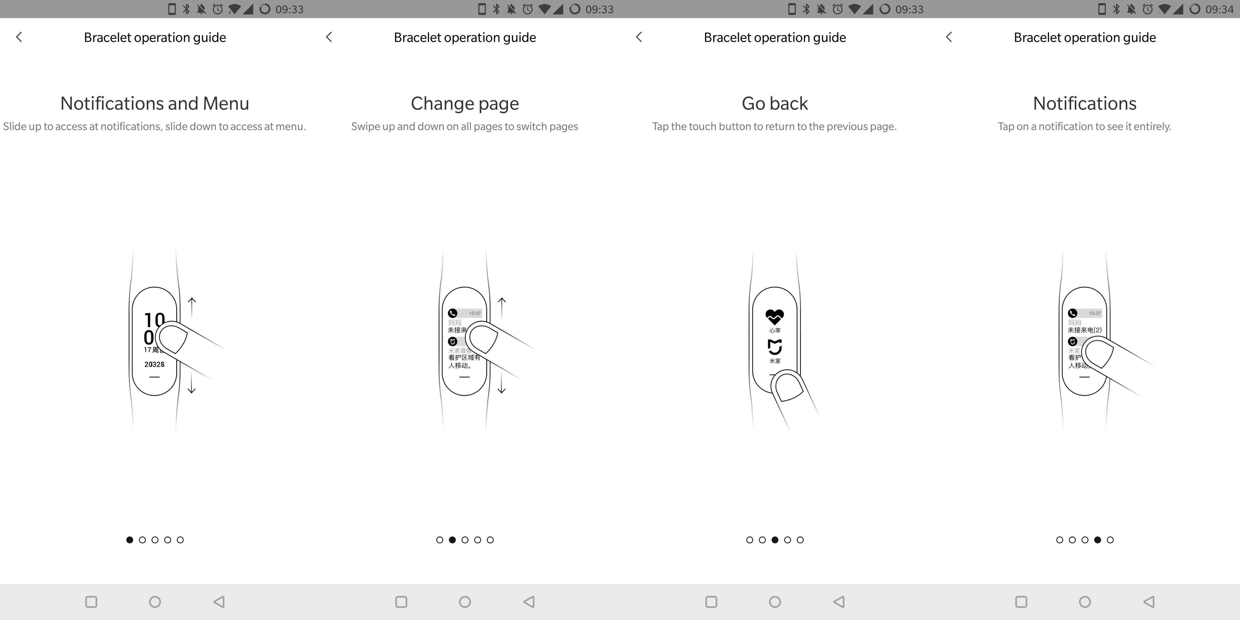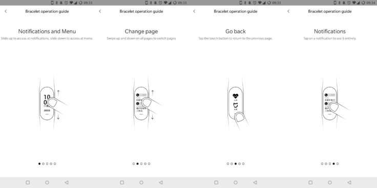 Das Display ist allerdings nicht nur größer, höher aufgelöst und farbig, sondern auch noch heller (3 Stufen möglich) und ist natürlich auch ein Touchscreen. Die Bedienung erfolgt übers Wischen nach oben und unten sowie dem Tippen auf einzelne Nachrichten oder Symbole. Immer einen Schritt zurückgeht man mit dem leuchtenden kapazitiven Button unter dem Bildschirm. Betätigt man diesen vibriert der Tracker kurz, was man aber auch deaktivieren kann.
