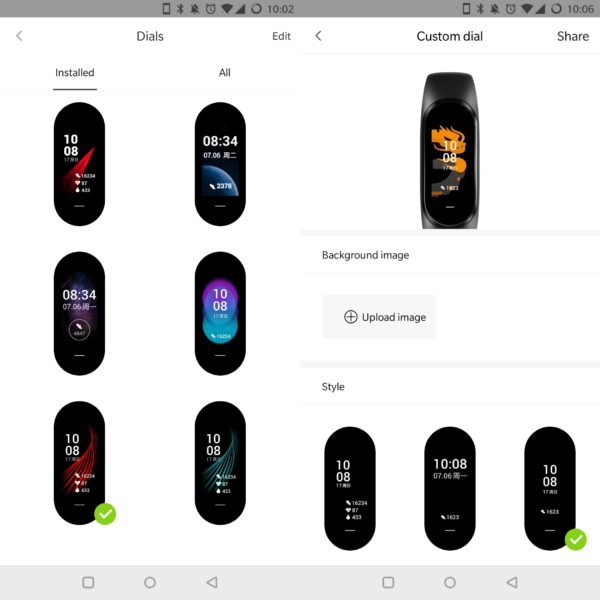 Neben diesen Standard-Funktionen kann man in der App auch den Hintergrund und die Watchfaces des Hey+ ändern. Neben den sechs vorinstallierten Hintergründen könnt ihr auch persönliche Bilder als Background setzen und dann noch aus drei verschieden Uhr-Stilen wählen. Ich habe jetzt einfach mal das China-Gadgets Logo genommen. Es empfiehlt sich natürlich ein Bild ohne bzw. mit schwarzem Hintergrund zu nehmen, um etwas Energie zu sparen.