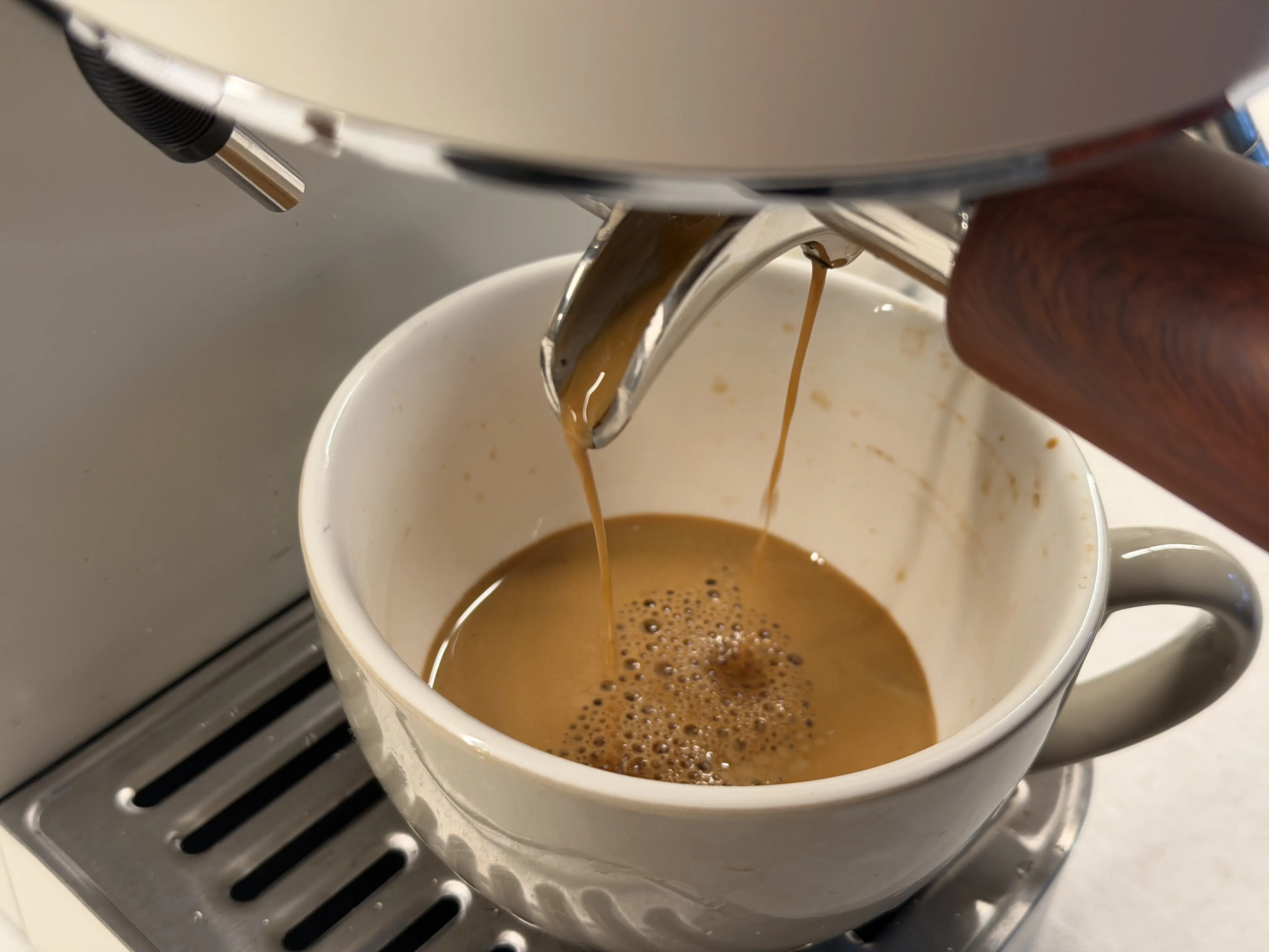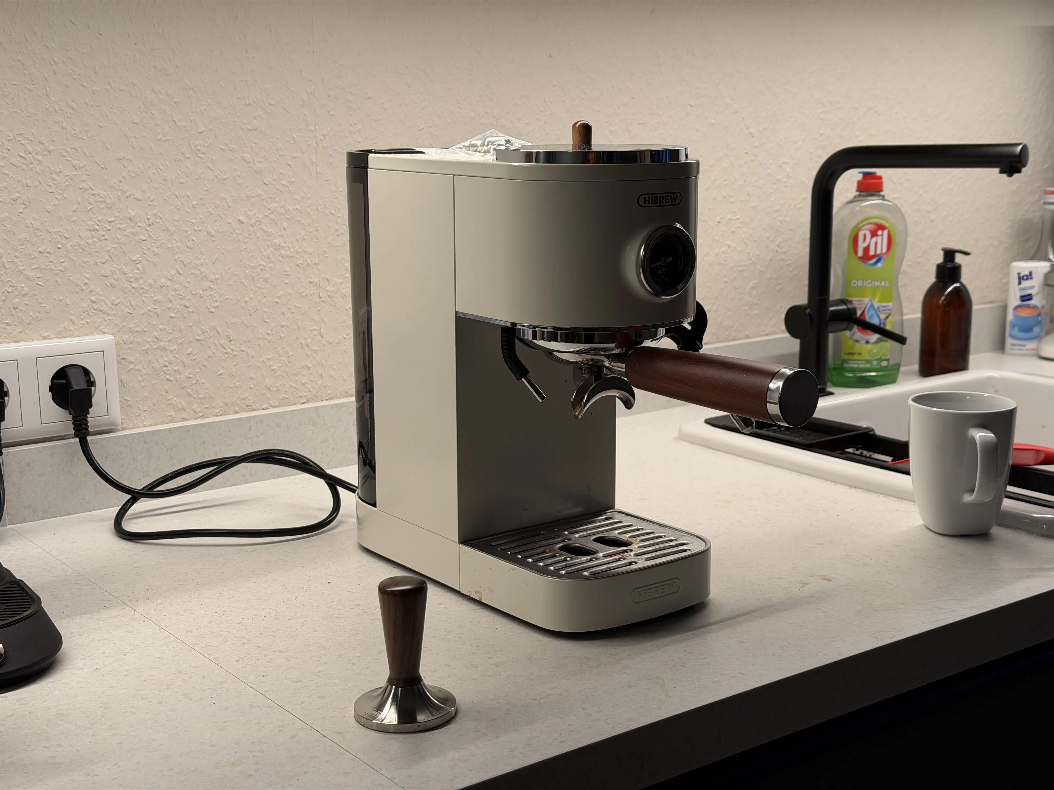 Machen wir uns nichts vor: So ein Siebträger soll schon auch cool aussehen. Die Edelstahl-Oberflächen stehen in der Wohnung und werden im Gegensatz zu einigen anderen Küchengeräten wie Air Fryern eigentlich nie weggeräumt. Die HiBREW H13 gibt es auch in dem Silber, aber auch in Cremeweiß. Wir haben letzteres bekommen und das sagt mir persönlich leider nicht zu. Dadurch hat sie einen leichten Retro-Charme, wenn man das mag. Die Holzoptik beim Siebträger, Tamper und dem Dampfventil sind da schon Highlights. Vorne gibt es noch ein Manometer (Druckanzeige) wie bei vielen Maschinen.