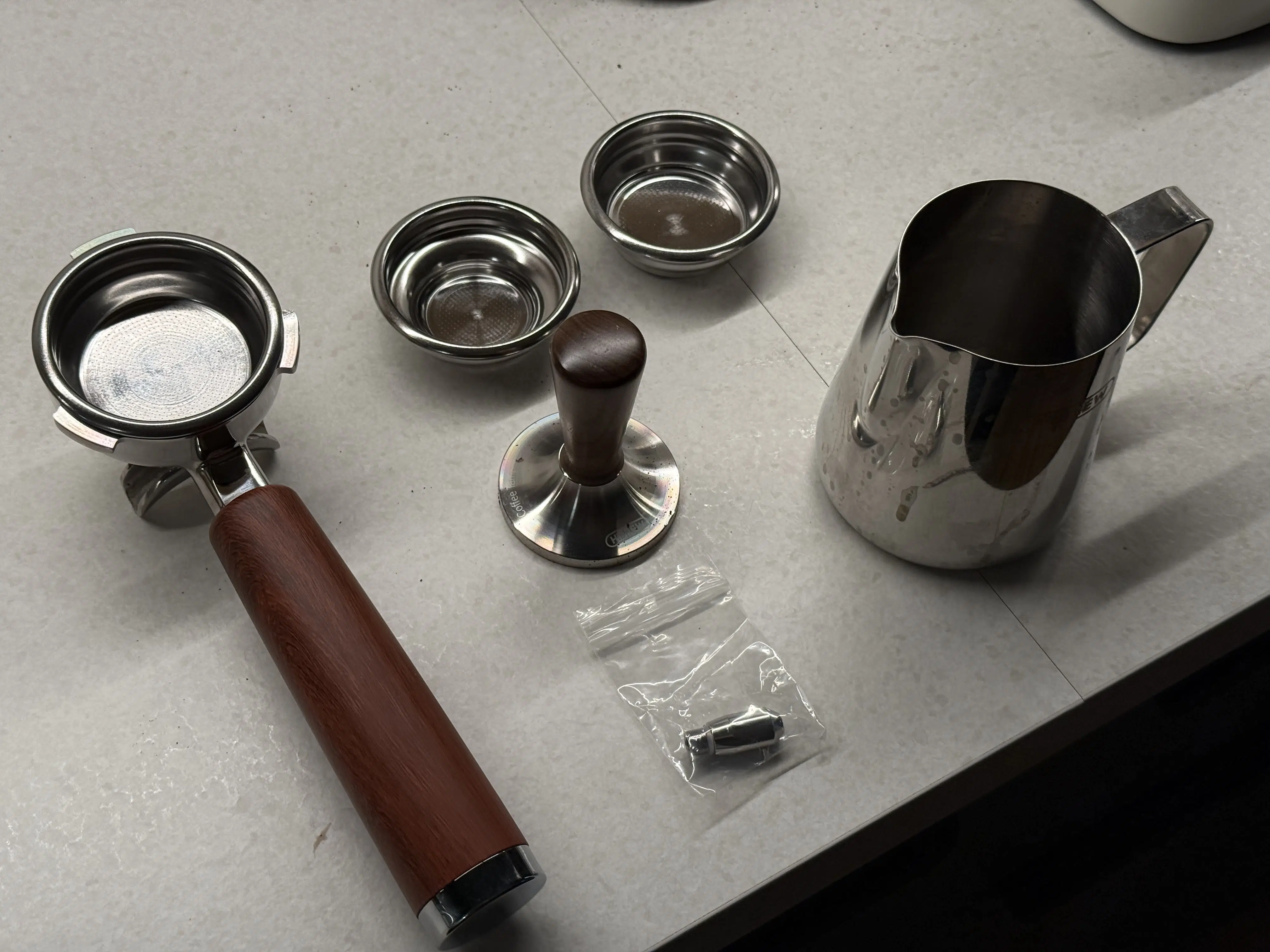 Hat man sich erstmal durch die schier unendlichen transparenten Plastiktüten gekämpft, warten da nämlich ein Edelstahl-Milchkännchen (Pitcher), zwei extra Siebe, eine Zweitdüse für die Dampflanze, der 58 mm Siebträger mit eingesetztem Sieb und ein Tamper (Stempel). Sowohl der Siebträger als auch der Tamper sind dabei meine Highlights. Nicht nur, dass sie jeweils einen Holzgriff in Walnuss-Optik bieten, nein, sie haben auch Gewicht. Das ist kein Plastikbomber, schließlich bringt er ca. 535g auf die Waage. Würde man mir sagen, dass der zu einer 1.000€ Maschine gehört, hätte ich nichts zu beanstanden. Auch der Tamper hat Gewicht und sogar eine Ripple-Basis. Das sieht cool aus und erinnert mich an meinen Normcore-Tamper, einen wirklichen positiven Effekt hat es aber nicht.