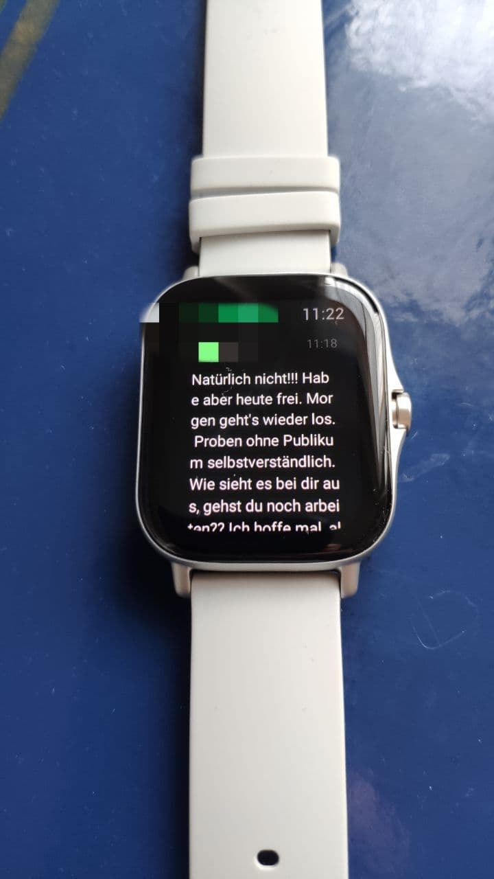 Die Benachrichtigungsfunktion ist wohl eine der wichtigsten Funktionen einer Smartwatch, damit man nicht immer das Smartphone aus der Hosentasche holen muss, um up to date zu sein. Wie immer gilt, dass auch die GTS 2 nur die Push-Benachrichtigungen, die auf eurem Handy ankommen, spiegeln kann. Man kann aber in der Zepp-App einstellen, von welcher App man Benachrichtigungen sehen möchte, zum Beispiel nur von WhatsApp. Man kann diese Nachrichten nur lesen und nicht darauf antworten. Das geht aktuell nur mit Smartwatches wie der Ticwatch Pro 3, der Samsung Galaxy Active 2 oder der Apple Watch SE.