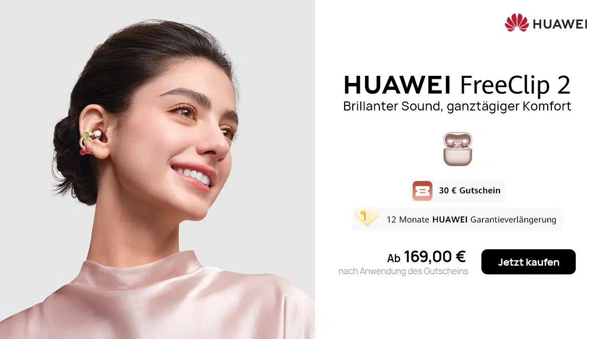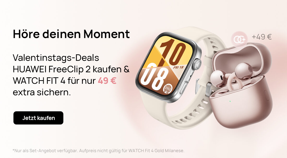 Eigentlich kosten die Premium-Kopfhörer 199€, aktuell bekommt ihr sie selbst in der neuen Farbe aber mit dem Gutschein AHW30FC26 für 169€ bei Huawei. Alternativ gibt es zum Valentinstag auch noch ein Bundle-Angebot von den FreeClip 2 zusammen mit der Huawei Watch Fit 4 für 228€. Wählt dafür das „Valentinstags Set“ auf der Produktseite aus.