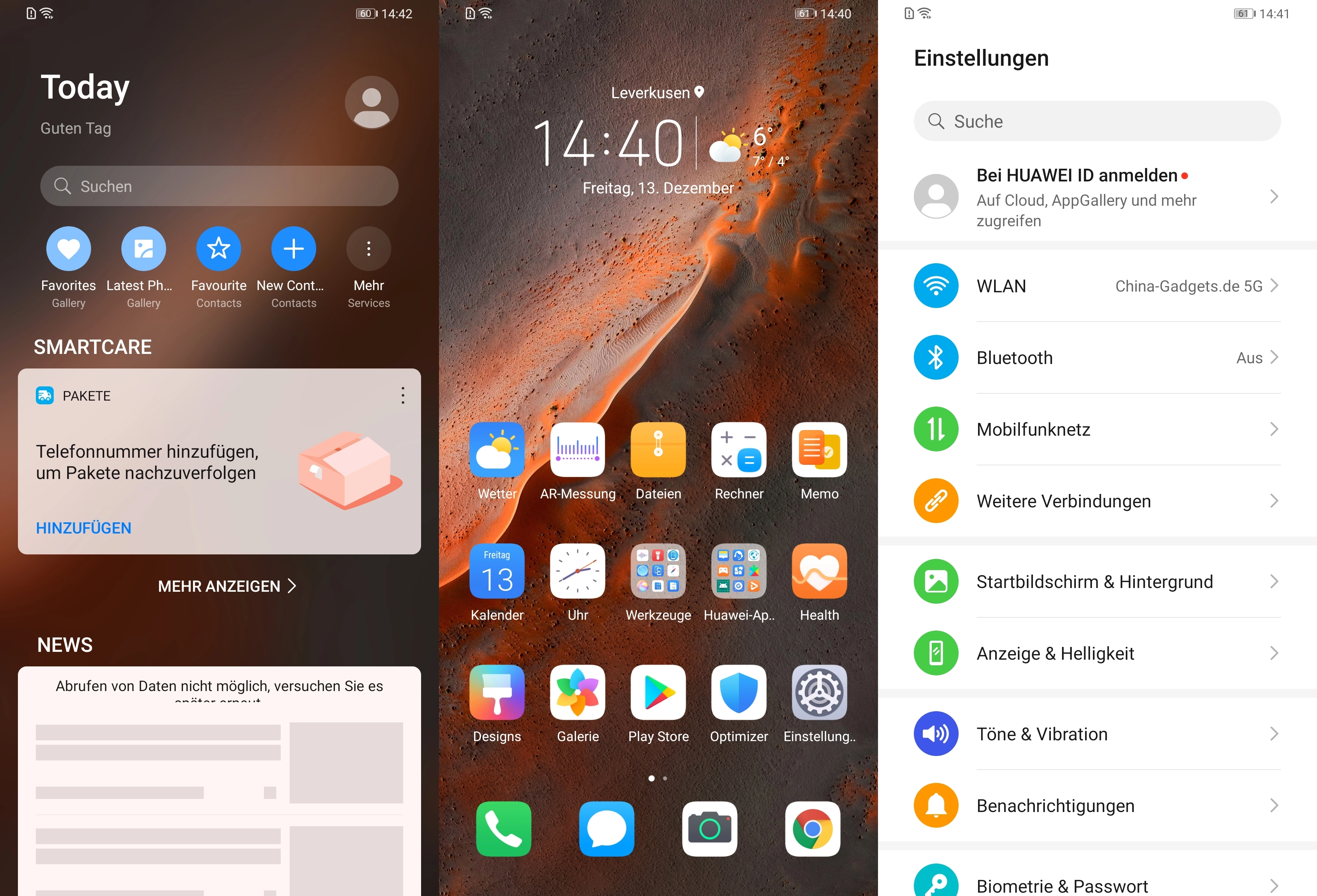Abgesehen von der Google-Thematik läuft das Mate 30 mit aktuellem Android 10 Q und Sicherheitsupdate von Oktober 2019. Über Android liegt wie immer die stark veränderte Oberfläche EMUI 10. Diese greift sehr stark ins System ein und ist wahrscheinlich am besten mit MIUI vergleichbar. EMUI wird dementsprechend auch unabhängig von der Android-Version weiterhin Updates erhalten, selbst wenn man erstmal auf Android 10 festhängt. Obwohl es sich bei unserem Gerät um die China-Version handelt, ist das System komplett auf Deutsch. Alle Einstellungen und Apps sind gut übersetzt und chinesische Schrift findet man nur extrem selten. Insgesamt kann man das Mate 30 also gut auf Deutsch nutzen, wenn man auf Google Pay sowie Netflix in HD verzichten kann und sich dem Risiko bewusst ist.