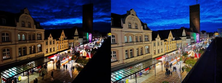 Teilweise ist die Entscheidung für oder gegen den Nachtmodus auch einfach eine Geschmacksfrage. Die linken Fotos erzeugen eine eher gemütliche abendliche Stimmung, während die rechten Bilder die Nacht zum Tag und viele Details überhaupt erst sichtbar machen.