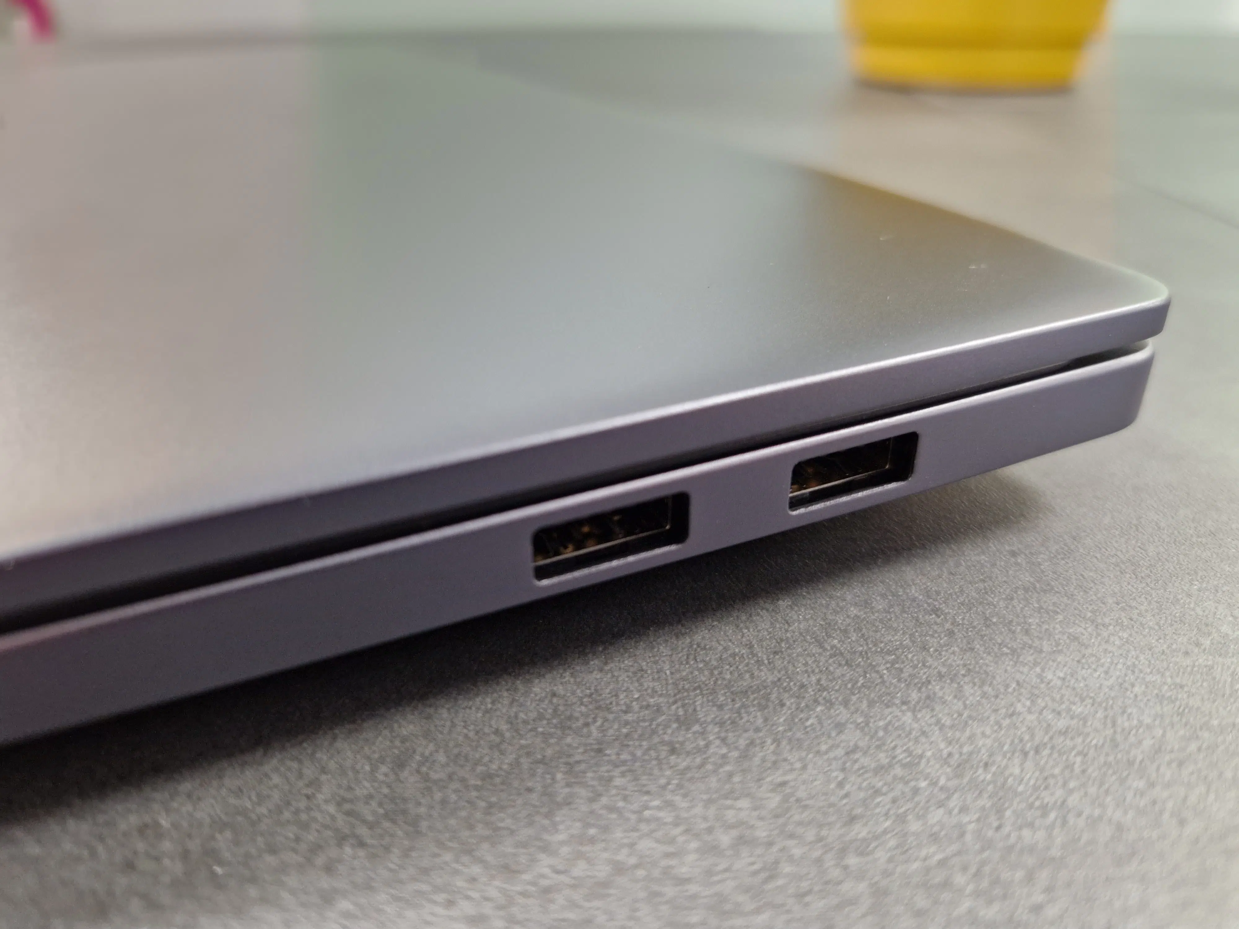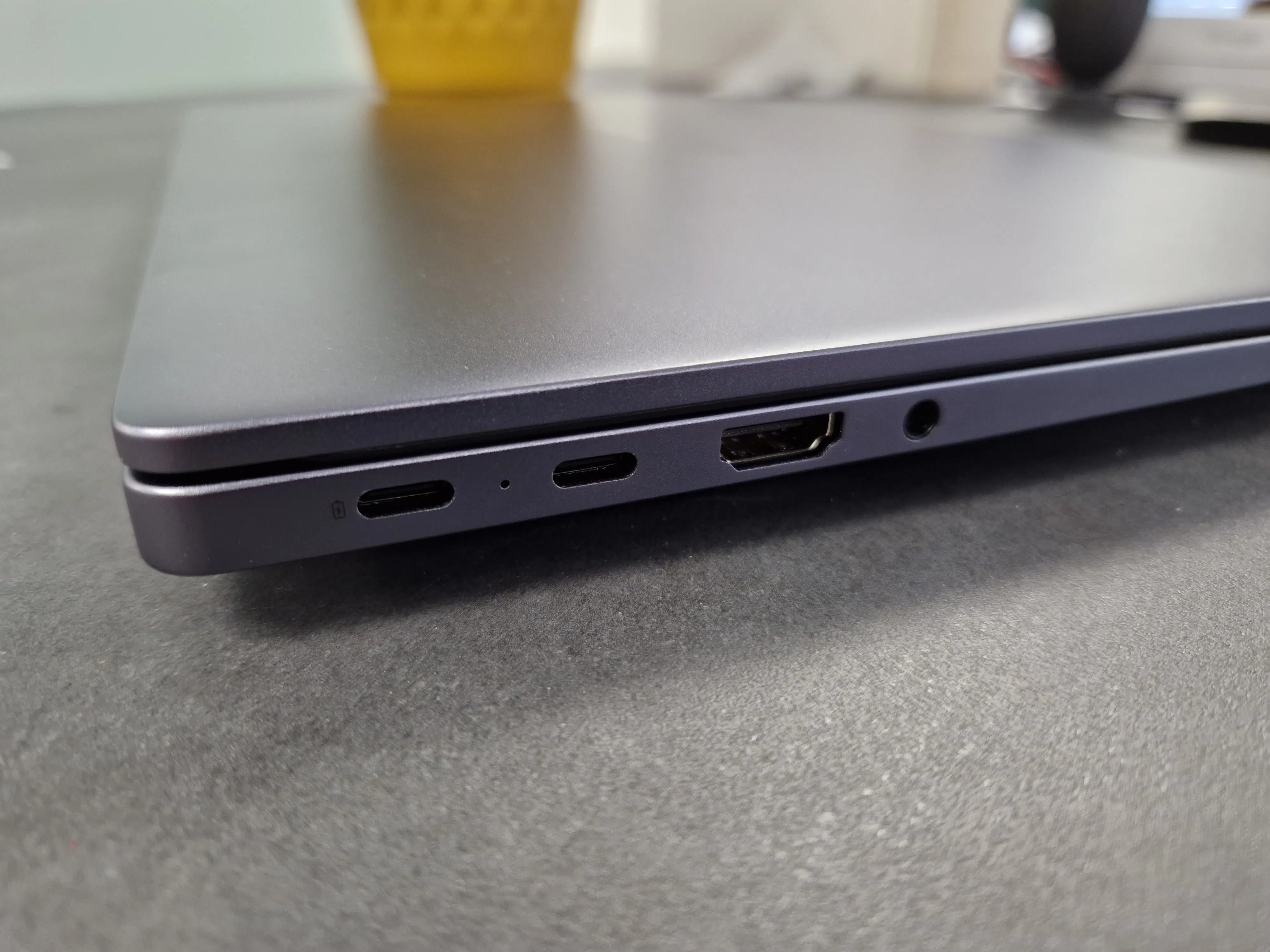An den Seiten finden sich verschiedene Anschlüsse. Auf der rechten Seite sitzen zwei USB-A Anschlüsse mit USB 3.2 Gen 1 und USB 2.0. Wechselt man die Seite, sitzen dort ein USB-C zum Laden und zur Datenübertragung und ein weiterer USB-C, welcher noch die Bildschirmausgabe unterstützt. Weitere Anschlüsse sind ein HDMI 2.0 Anschluss und ein 3,5 mm Kopfhöreranschluss.