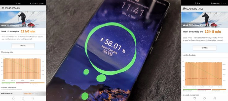 Im PCMark Akku Benchmark hält das P40 ganze 13 Stunden und 8 Minuten durch, das P40 Pro kommt auf genau 12 Stunden. Der Test wurde bei beiden Smartphones mit halber Bildschirmhelligkeit und aktiviertem WLAN durchgeführt. Mit beiden Handys kommt man bei durchschnittlicher Nutzung also ca. 1,5-2 Tage aus. Beim P40 Pro hat man sogar noch einen größeren Puffer, da ich das Handy durchgängig mit 90Hz genutzt habe. Würde man die Bildwiederholrate in den Optionen auf 60Hz stellen sind sicher noch ein paar Stunden mehr drin. Das Aufladen dauert beim P40 mit 22,5 Watt fast 2 Stunden, das P40 Pro ist dank 40 Watt Ladegerät schon nach 70 Minuten wieder bei 100%.