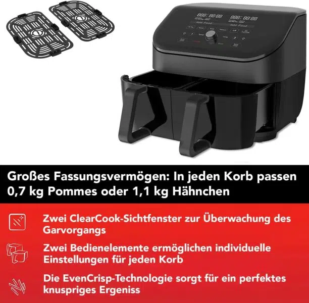 Dabei haben die einzelnen Garkörbe eine Größe ausreichend für 0,7 kg Pommes oder ein 1,1 Kilo schweres Hähnchen. Dank der zwei synchronisierten Kochprogramme, SyncFinish und SyncCook, kann man entweder zwei Zubereitungsarten gleichzeitig abschließen lassen oder zwei Portionen gleichzeitig gleich zubereiten.