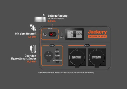 Aufgeladen wird der Li-Ionen-Akku mit einer Kapazität von 1002 Wh dank integriertem MPPT-Laderegler beispielsweise durch zwei 100 W Panels in ca. 8 Stunden, durch die Steckdose innerhalb von 7,5 Std und durch einen 12V Autostecker in ca. 14 Std. Ecoflow ist hier mit dem Schnellladen insbesondere über Solar deutlich fixer unterwegs. Ein großer Vorteil allerdings: Ihr könnt mit der Jackery Explorer 1000 gleichzeitig laden und entladen.