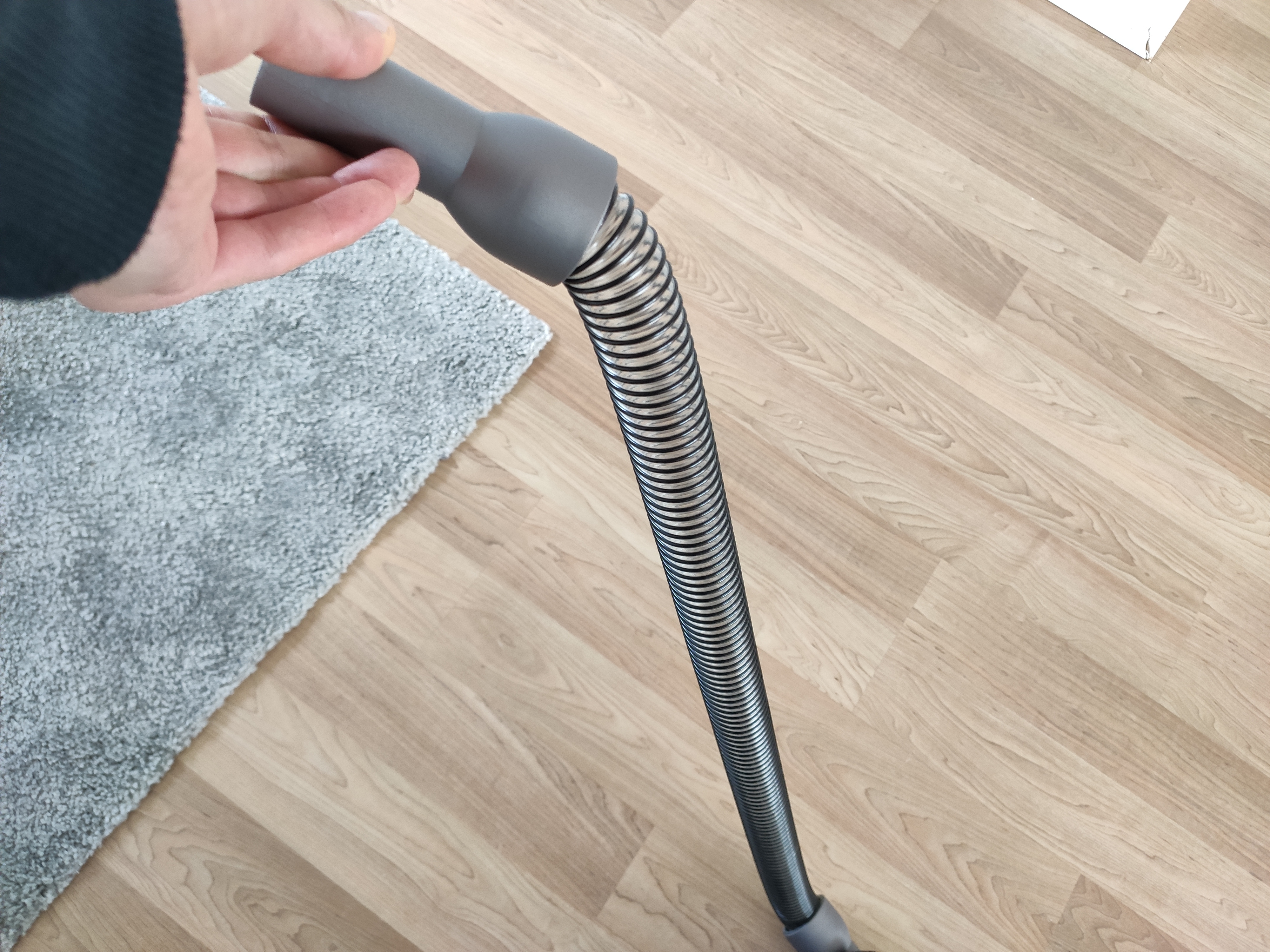 Da sich der Schalter auf Höhe des sichtbaren Schlauchs mittig befindet, muss man sich auch zwingend bücken, um das Knickrohr zu nutzen. Soviel also zum Schutz der Muskelpartien. Hier wäre ein Button am Griff oder ähnliches sinnvoller, den man nur einmal drücken müsste, damit sich das Saugrohr umklappen ließe.