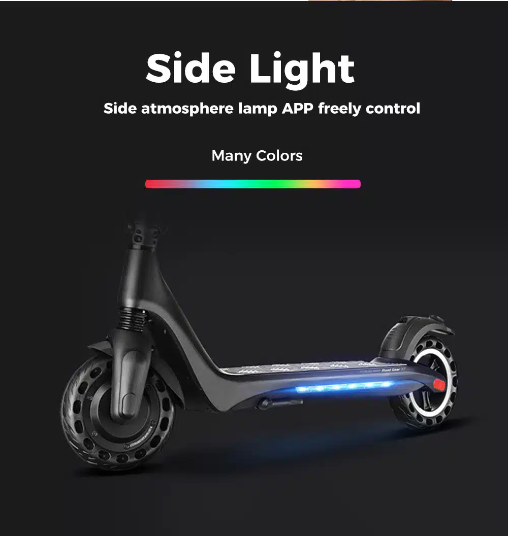 Ein Zusatzfeature sind LEDs an den Seiten des Trittbretts, die sogar bunt leuchten und per App eingestellt werden können. Nett, wenn man einen cool leuchtenden Roller haben möchte; in Deutschland aber ebenfalls nicht erlaubt.