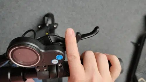Es gibt kein fest im Lenker verbautes Display, stattdessen handelt es sich hier um ein separates Teil, das zwar mit Kabeln mit dem Roller verbunden ist, aber nach dem Auspacken erst angeschraubt werden muss. Hier ist übrigens auch der Gashebel befestigt – oberhalb der Lenkstange, nicht darunter wie bei eigentlich allen anderen Modellen. Das bringt nochmal ganz andere Probleme mit sich, zu denen ich aber gleich noch komme. Über das Display und die beiden Tasten lassen sich per einiger Tastenkombinationen, die nicht in der Anleitung erklärt werden, viele Einstellungen an der Elektronik des Rollers vornehmen.